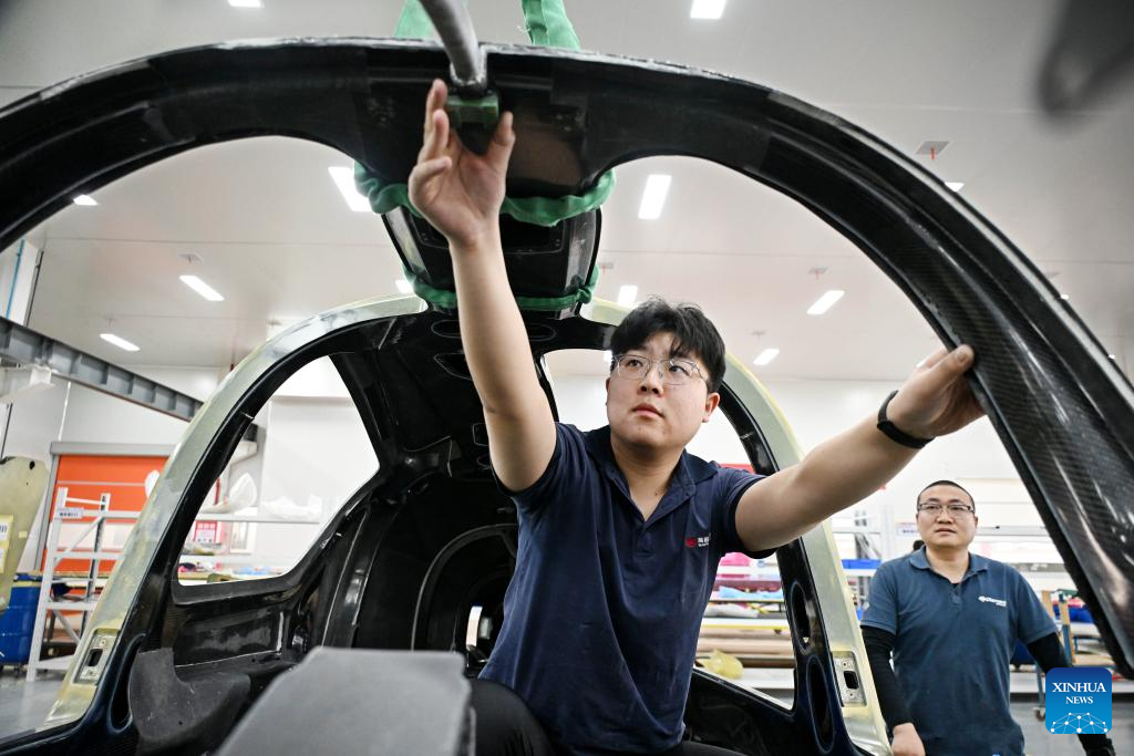 A staff member conducts an assembly task at an aircraft manufacturing workshop of Wanfeng Auto Holding Group in Laixi City, east China's Shandong Province, April 2, 2026.