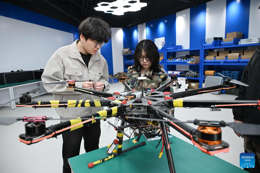 Students learn drone maintenance at Qingdao Vocational College of Aeronautical Science and Technology in Laixi City, east China's Shandong Province, April 2, 2026.