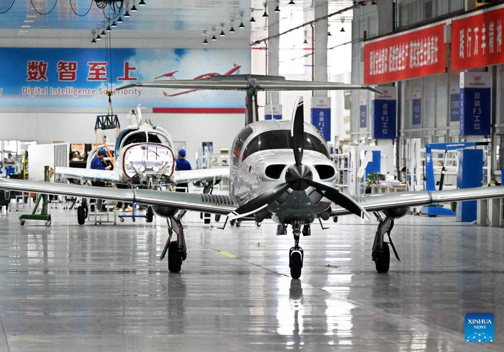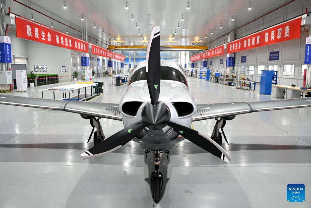 This photo taken on April 2, 2026 shows a Diamond DA50 aircraft ready to roll off the production line at an aircraft manufacturing workshop of Wanfeng Auto Holding Group in Laixi City, east China's Shandong Province.