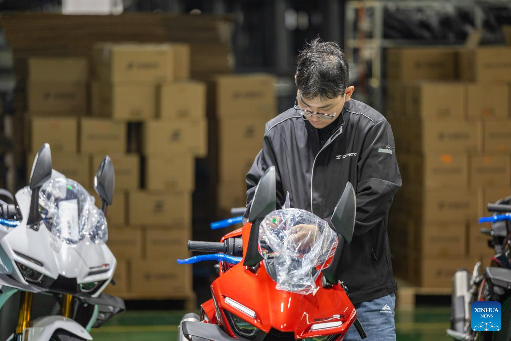 A staff member inspects the motorcycles for export at the factory building of ZXMOTO in Liangjiang New Area, southwest China's Chongqing, April 1, 2026.(Xinhua/Huang Wei)