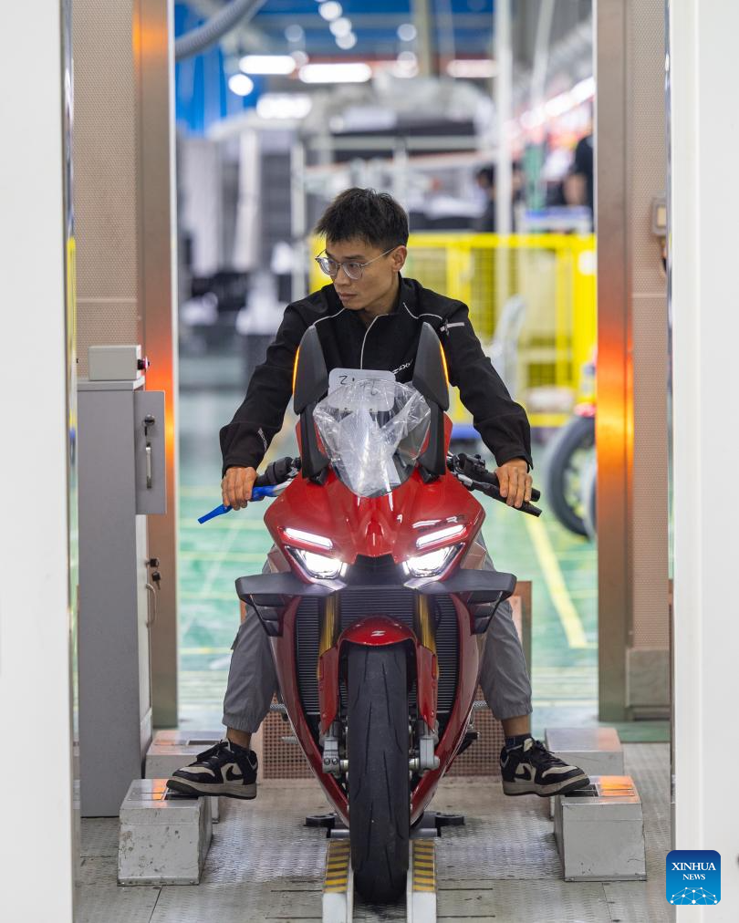 A staff member conducts inspections on a motorcycle at the production workshop of ZXMOTO in Liangjiang New Area, southwest China's Chongqing, April 1, 2026.(Xinhua/Huang Wei)