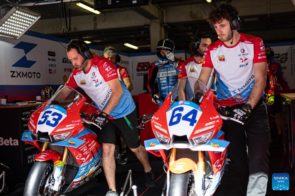 Staff members conduct a pre-race inspection on the two competing motorcycles of ZXMOTO before the World Supersport (WorldSSP) category at the Portuguese round of the Superbike World Championship (WSBK) at the Portimao Circuit in Portugal, March 27, 2026.(Xinhua)