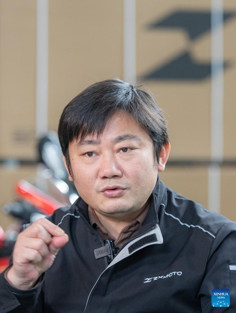 Zhang Xue, founder of Chinese motorcycle manufacturer ZXMOTO, receives an interview at the factory building of ZXMOTO in Liangjiang New Area, southwest China's Chongqing, April 1, 2026.(Xinhua/Huang Wei)
