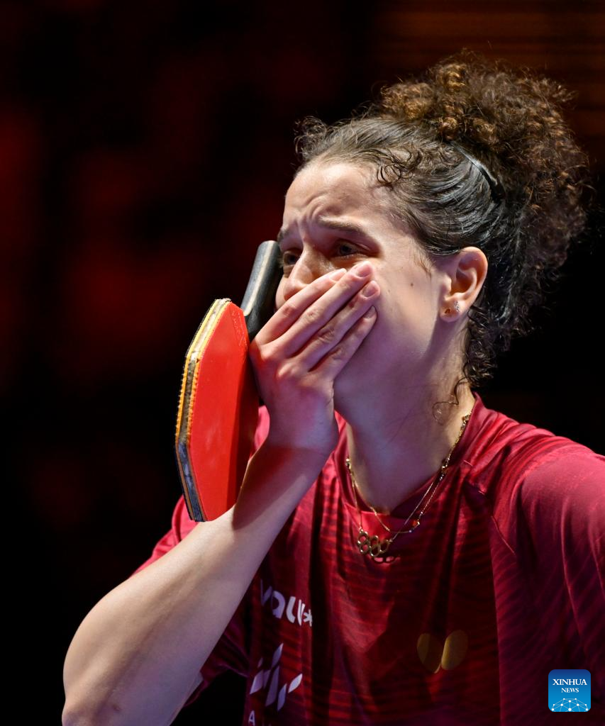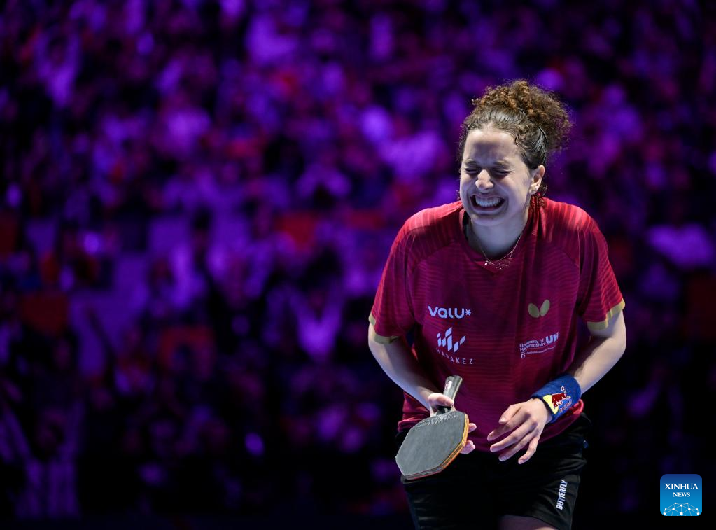 Hana Goda of Egypt reacts during the women's singles quarterfinal match between Sun Yingsha of China and Hana Goda of Egypt at the ITTF Men's and Women's World Cup 2026 in Macao, China, April 4, 2026. (Xinhua/Yu Yang)