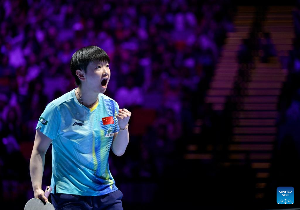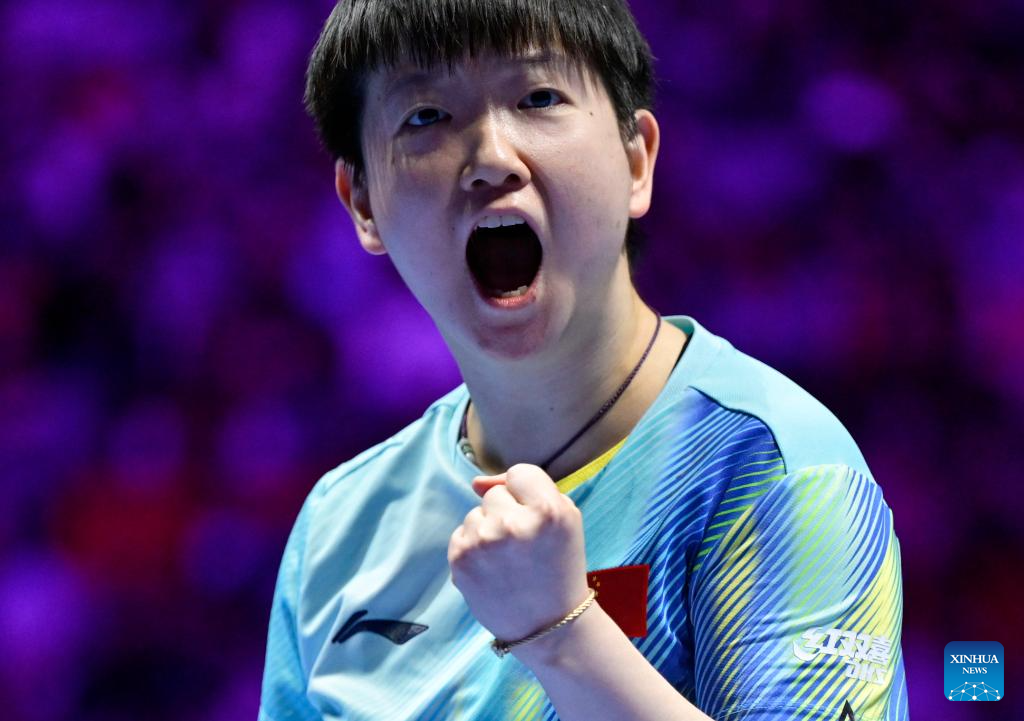 Sun Yingsha of China celebrates during the women's singles quarterfinal match between Sun Yingsha of China and Hana Goda of Egypt at the ITTF Men's and Women's World Cup 2026 in Macao, China, April 4, 2026. (Xinhua/Yu Yang)