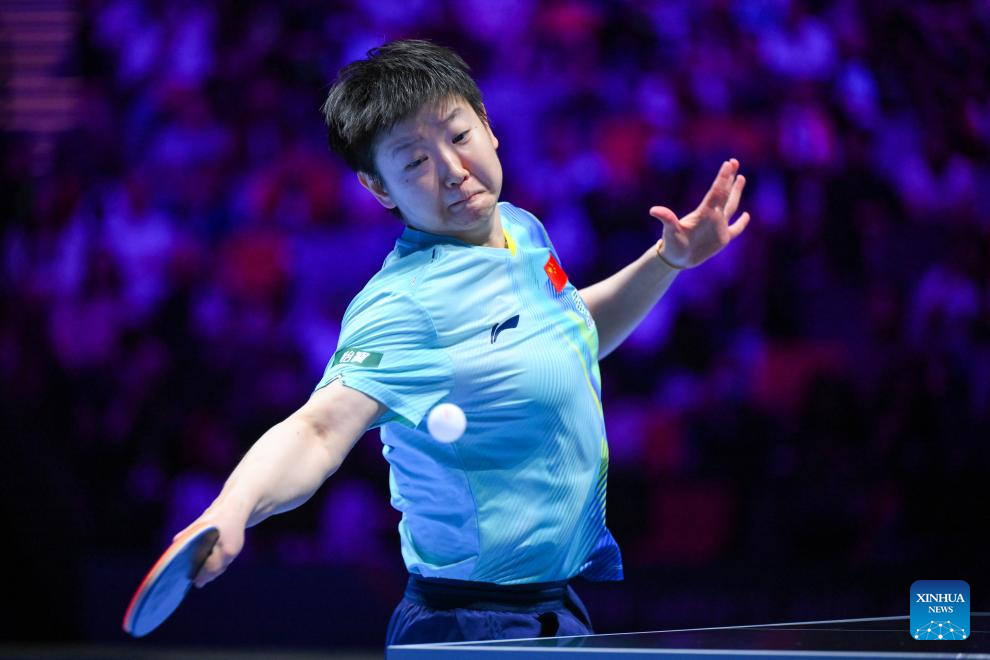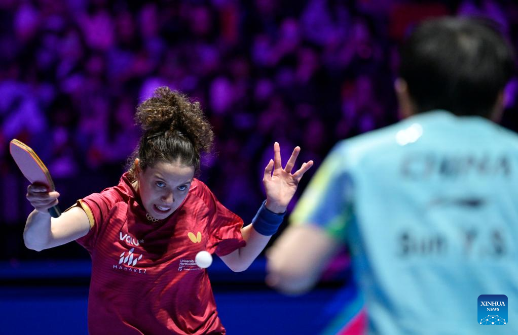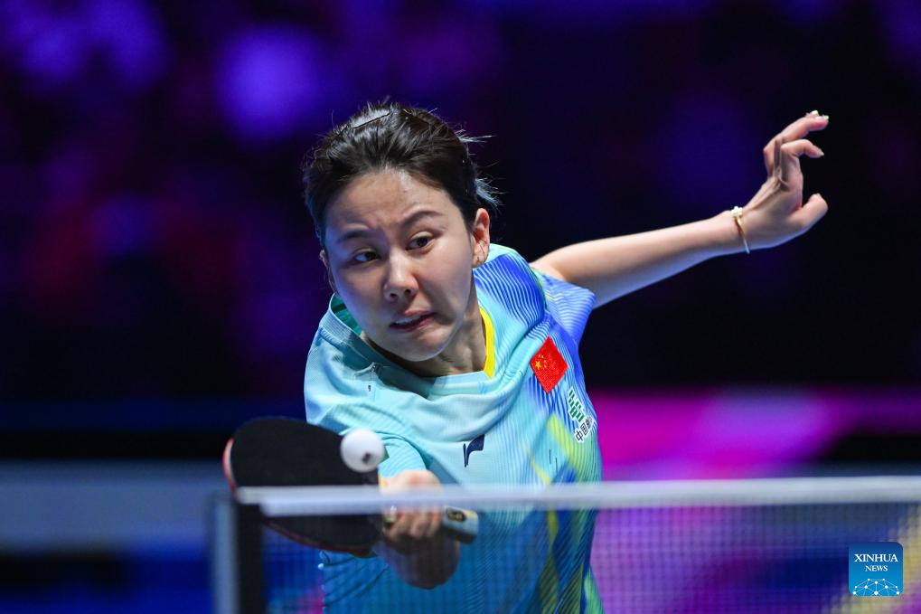 Sun Yingsha of China hits a return during the women's singles quarterfinal match between Sun Yingsha of China and Hana Goda of Egypt at the ITTF Men's and Women's World Cup 2026 in Macao, China, April 4, 2026. (Xinhua/Cheong Kam Ka)