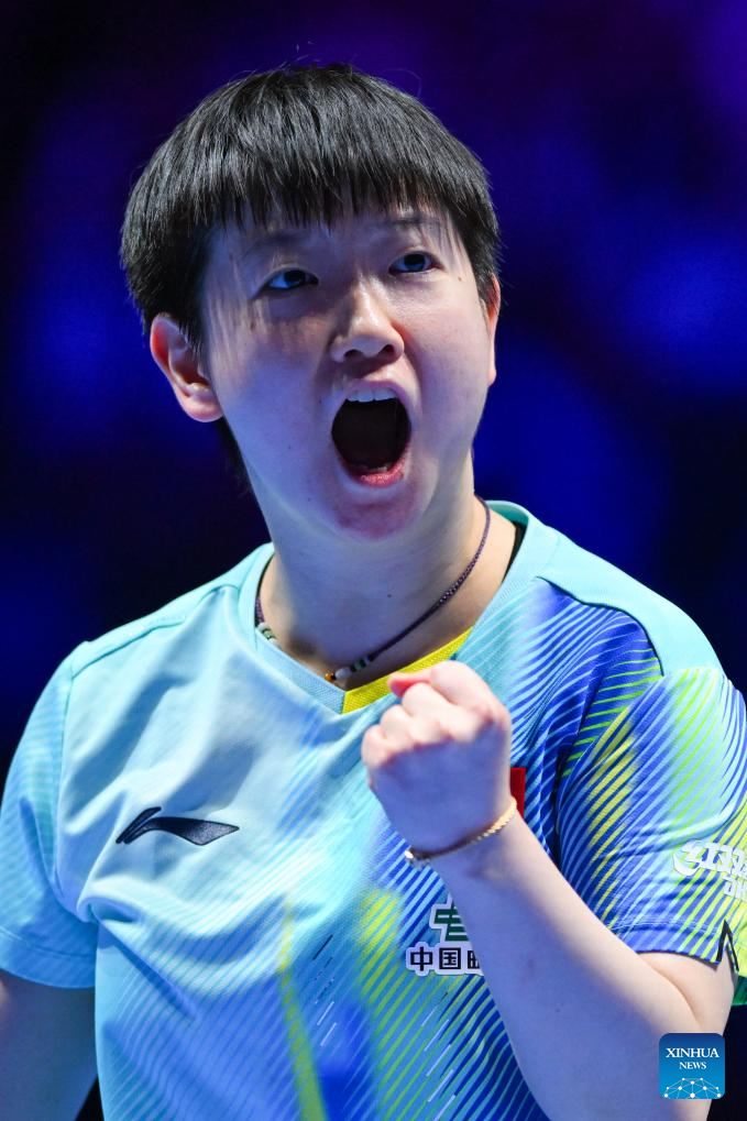 Sun Yingsha of China celebrates during the women's singles quarterfinal match between Sun Yingsha of China and Hana Goda of Egypt at the ITTF Men's and Women's World Cup 2026 in Macao, China, April 4, 2026. (Xinhua/Cheong Kam Ka)