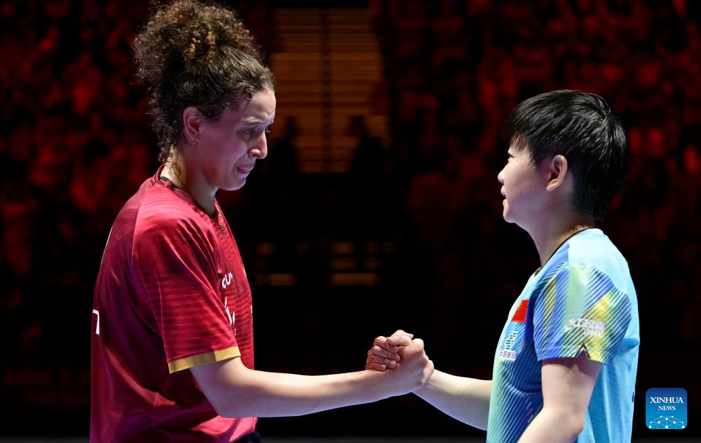 Sun Yingsha (R) of China shakes hands with Hana Goda of Egypt after their women's singles quarterfinal match at the ITTF Men's and Women's World Cup 2026 in Macao, China, April 4, 2026. (Xinhua/Yu Yang)