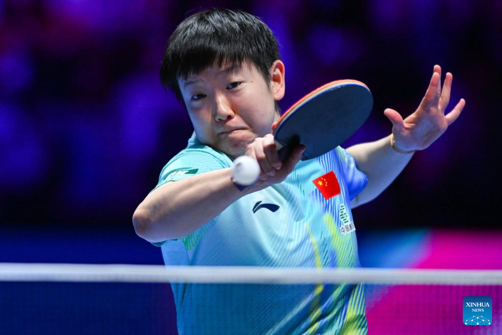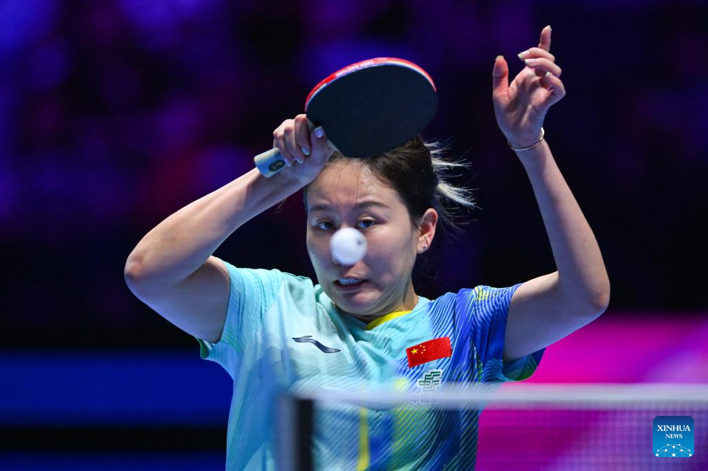 Chen Xingtong hits a return during the women's singles quarterfinal match between Chen Xingtong of China and Shin Yubin of South Korea at the ITTF Men's and Women's World Cup 2026 in Macao, China, April 4, 2026. (Xinhua/Cheong Kam Ka)