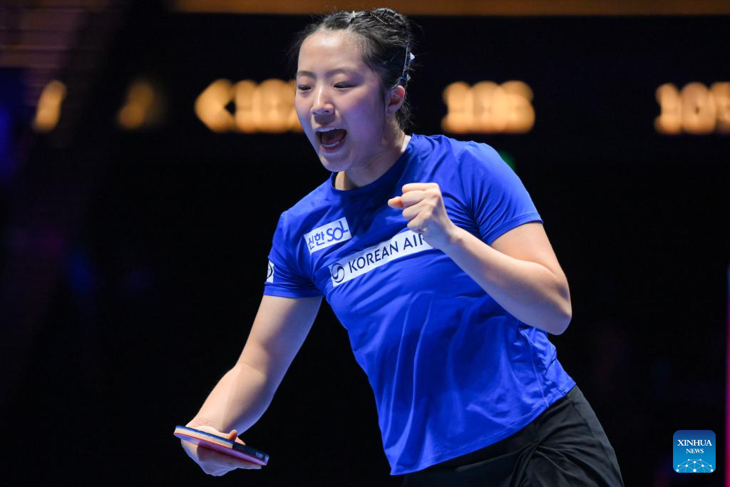 Shin Yubin celebrates during the women's singles quarterfinal match between Chen Xingtong of China and Shin Yubin of South Korea at the ITTF Men's and Women's World Cup 2026 in Macao, China, April 4, 2026. (Xinhua/Cheong Kam Ka)