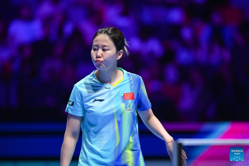 Chen Xingtong reacts during the women's singles quarterfinal match between Chen Xingtong of China and Shin Yubin of South Korea at the ITTF Men's and Women's World Cup 2026 in Macao, China, April 4, 2026. (Xinhua/Cheong Kam Ka)