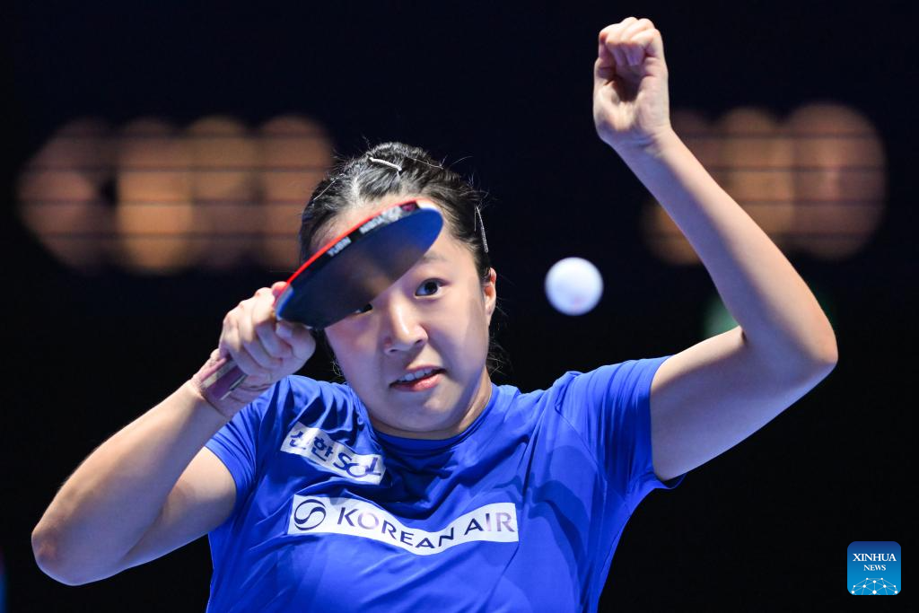 Shin Yubin hits a return during the women's singles quarterfinal match between Chen Xingtong of China and Shin Yubin of South Korea at the ITTF Men's and Women's World Cup 2026 in Macao, China, April 4, 2026. (Xinhua/Cheong Kam Ka)