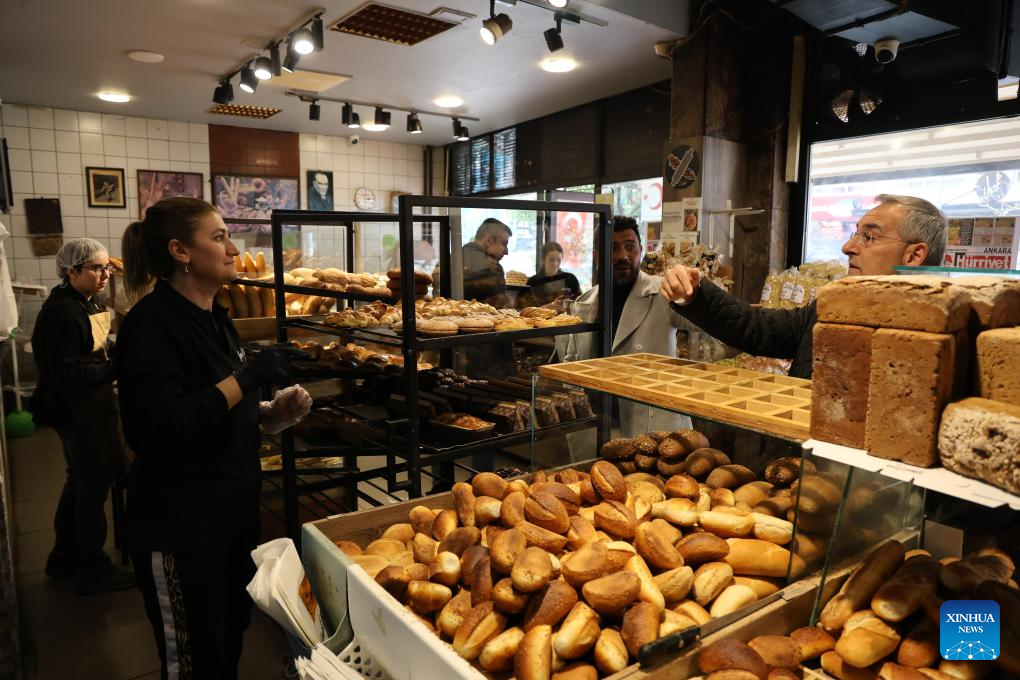 People buy bread at a bakery in Ankara, Türkiye, on April 2, 2026. Bread, a daily staple for millions of Turks, has grown more expensive, underscoring how regional instability and surging energy costs are squeezing household budgets across the country. (Mustafa Kaya/Handout via Xinhua)