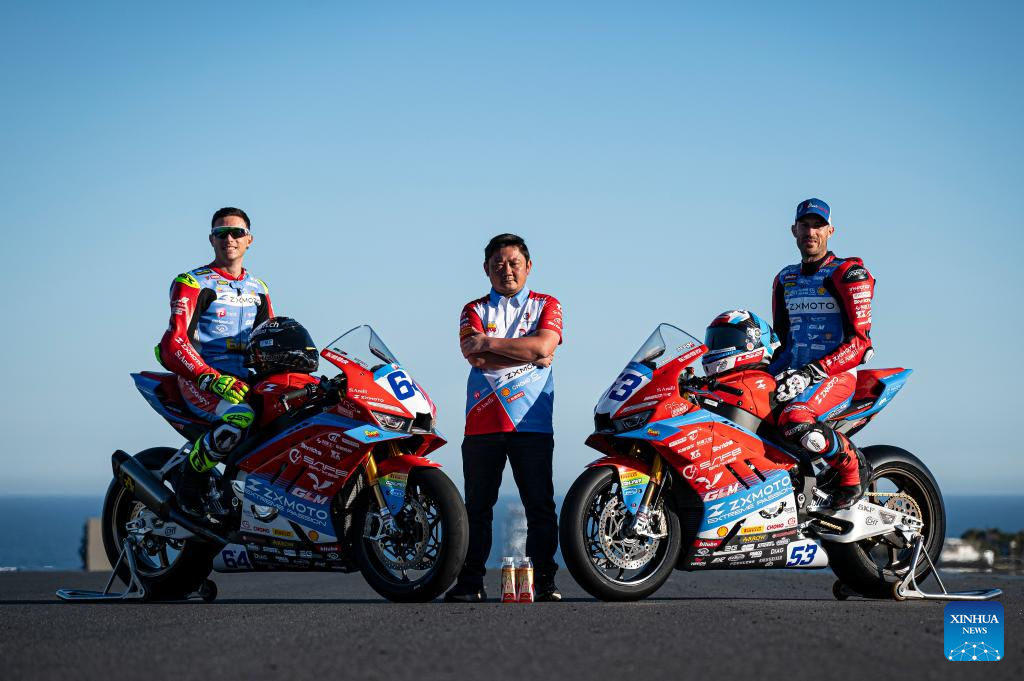French rider Valentin Debise (R) and Italian rider Federico Caricasulo (L) pose with Zhang Xue (C), brand founder and owner of Chinese motorcycle manufacturer ZXMOTO, at Phillip Island Grand Prix Circuit in Australia, Feb. 20, 2026. (Xinhua)