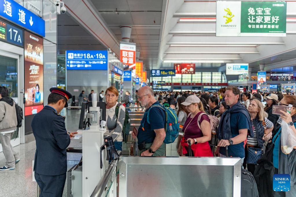 Foreign passengers check in at Guiyang North Railway Station in Guiyang, southwest China's Guizhou Province, April 3, 2026. China is likely to see 90.5 million railway passenger trips from Friday to next Tuesday during the upcoming Qingming Festival holiday travel rush, according to the national railway operator.