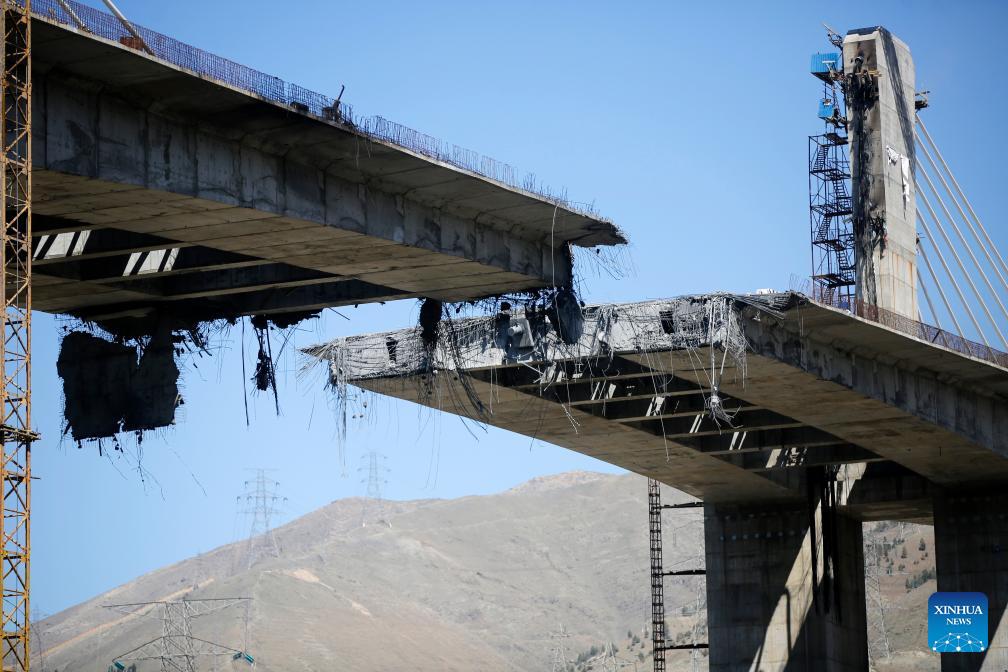 This photo taken on April 3, 2026 shows the damaged B1 bridge after U.S.-Israeli attacks in Karaj, Iran. The B1 bridge, located in the provincial capital Karaj, is one of the highest bridges in the Middle East and among the most complicated projects in Iran. It was targeted twice in U.S.-Israeli attacks on Thursday, leaving 13 dead and 95 wounded, the official news agency IRNA reported Friday. (Xinhua)