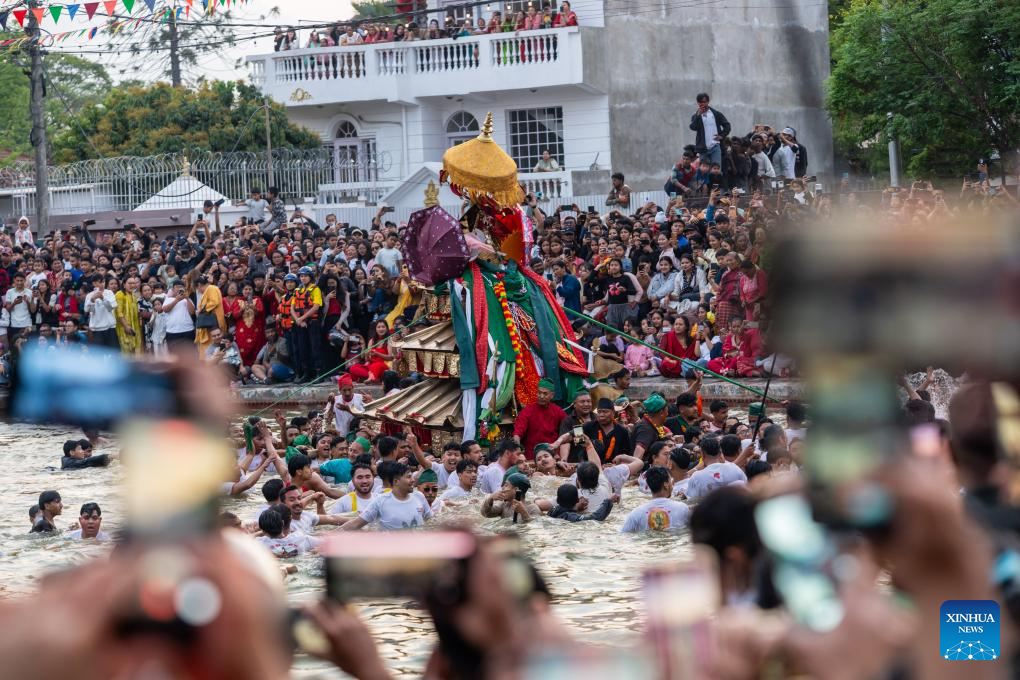 Local people carry the chariot of Goddess Tundaldevi on their shoulders and search for the lost jewelry during the traditional Gahana Khojne Jatra festival in Kathmandu, Nepal, April 3, 2026. (Photo by Hari Maharjan/Xinhua)