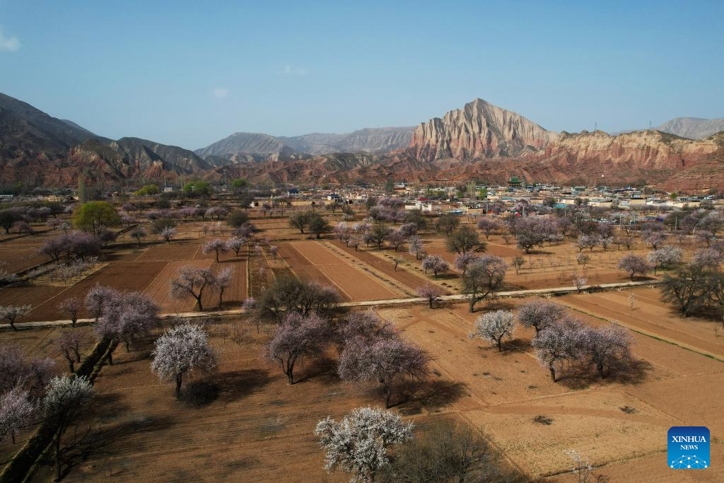 This photo taken on April 3, 2026 shows a view of apricot blossoms in Tangwang Town of Dongxiang Autonomous County, northwest China's Gansu Province. Apricot blossoms in Tangwang Town are in full bloom, attracting people for spring outings. With about 10,000 mu (667 hectares) of apricot trees, the town is leveraging this resource to develop local tourism industry. (Xinhua/Zhang Zhimin)