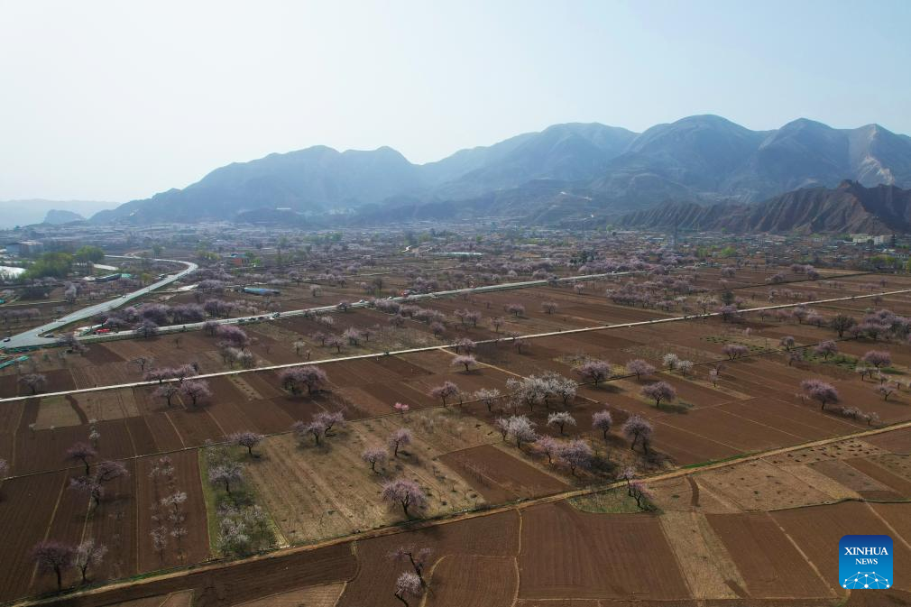An aerial drone photo taken on April 3, 2026 shows a view of apricot blossoms in Tangwang Town of Dongxiang Autonomous County, northwest China's Gansu Province. Apricot blossoms in Tangwang Town are in full bloom, attracting people for spring outings. With about 10,000 mu (667 hectares) of apricot trees, the town is leveraging this resource to develop local tourism industry. (Xinhua/Zhang Zhimin)