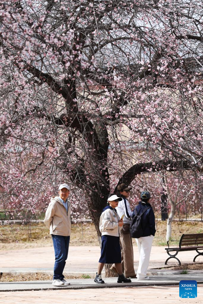 Tourists enjoy the scenery of apricot blossoms in Tangwang Town of Dongxiang Autonomous County, northwest China's Gansu Province, April 3, 2026. Apricot blossoms in Tangwang Town are in full bloom, attracting people for spring outings. With about 10,000 mu (667 hectares) of apricot trees, the town is leveraging this resource to develop local tourism industry. (Xinhua/Zhang Zhimin)