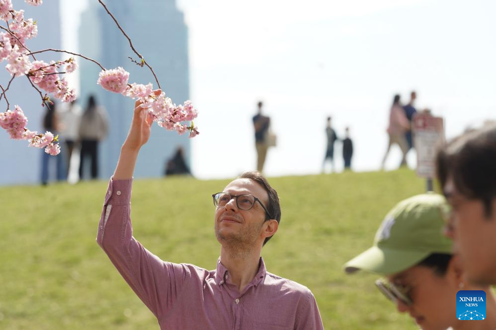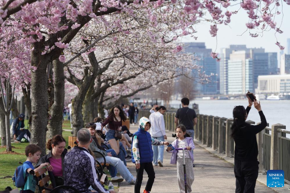 People enjoy leisure time under blooming cherry trees in New York, U.S.-Xinhua