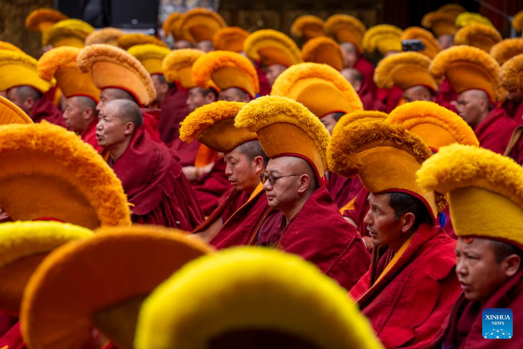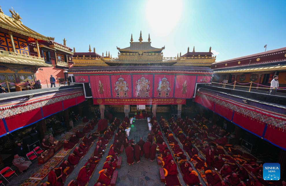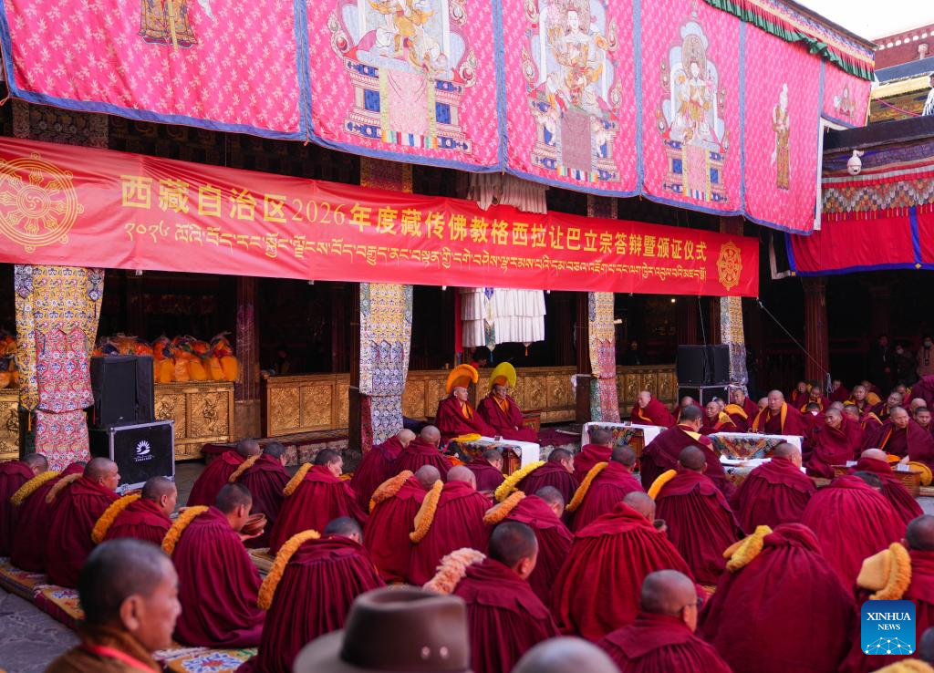 Monks attend a sutra debate and award ceremony conferring the title of Geshe Lharampa at the Jokhang Temple in Lhasa, southwest China's Xizang Autonomous Region, April 5, 2026. Thirteen monks obtained the degree of Geshe Lharampa following a sutra debate on Sunday in southwest China's Xizang Autonomous Region. Geshe Lharampa is the highest degree in the exoteric teachings of the Gelug school of Tibetan Buddhism, equivalent to a doctoral degree in modern education. (Xinhua/Tenzing Nima Qadhup)