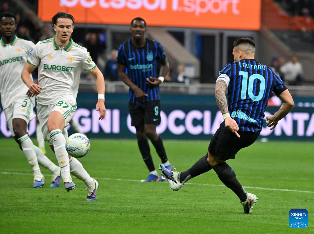 Inter Milan's Lautaro Martinez celebrates his goal during a Serie A football match between Inter Milan and Roma in Milan, Italy, April 5, 2026. (Photo by Alberto Lingria/Xinhua)