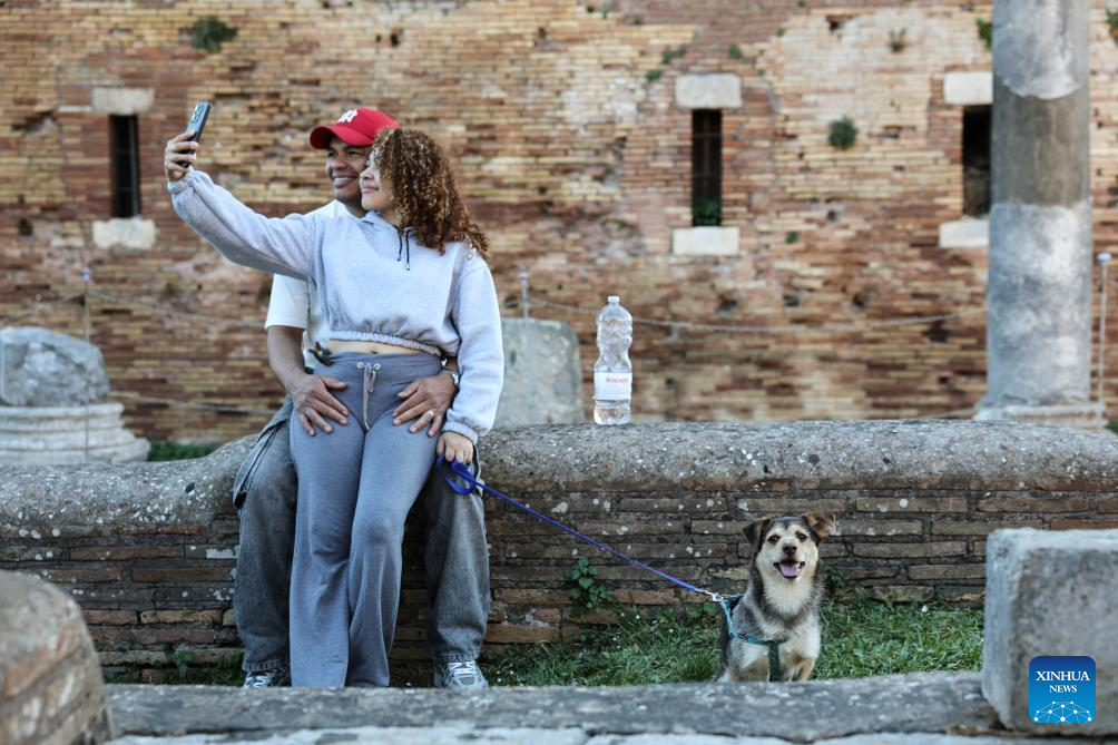 People take selfies at the Archaeological Park of Ostia Antica in Rome, Italy, April 5, 2026. Most of the museums and state archaeological sites across Italy opened their doors for free on Sunday as part of the monthly "Sunday at the Museum" initiative. (Xinhua/Li Jing)