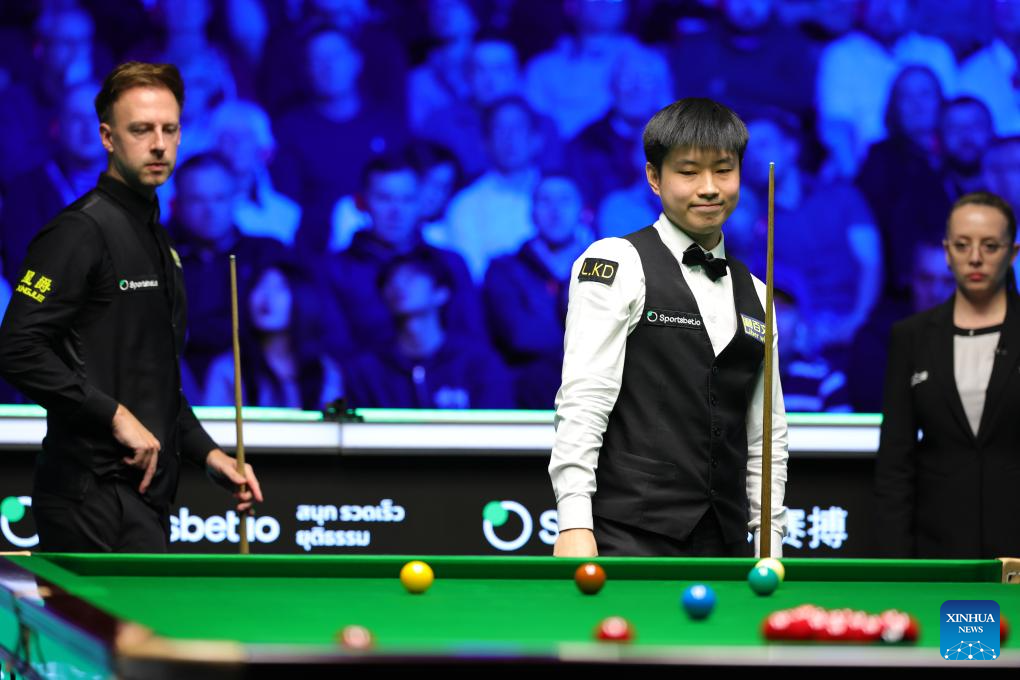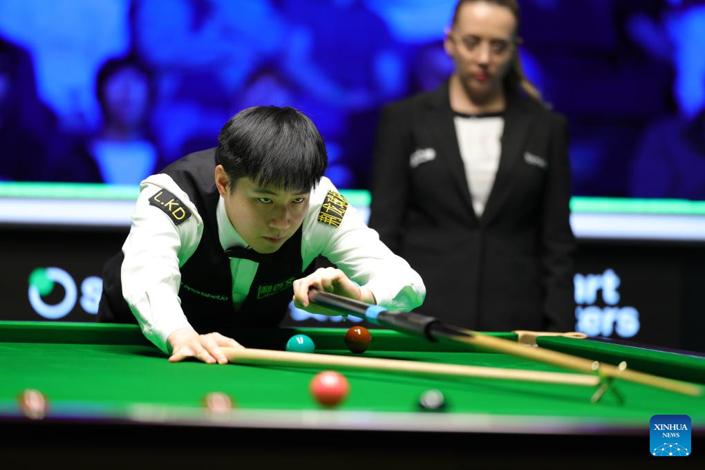 Zhao Xintong (C) of China competes during the final between Zhao Xintong of China and Judd Trump of England at the 2026 Snooker Tour Championship in Manchester, Britain, April 5, 2026. (Photo by Zhai Zheng/Xinhua)