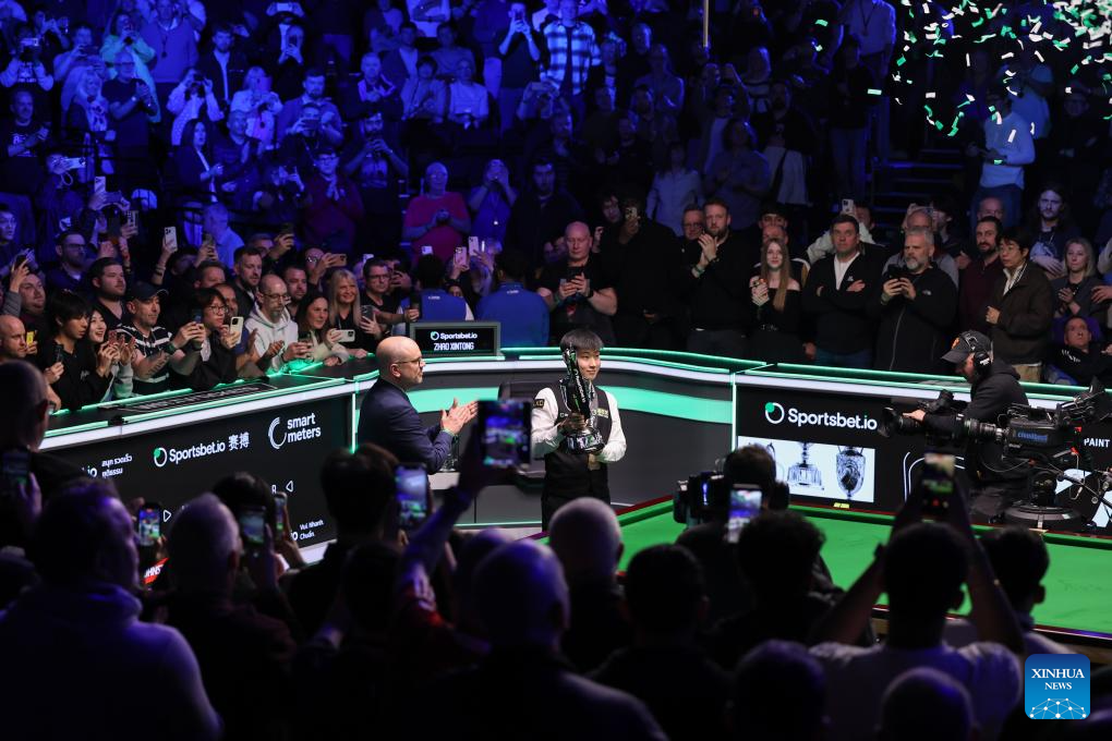 Zhao Xintong (C) of China celebrates with his trophy during the awarding ceremony after the final between Zhao Xintong of China and Judd Trump of England at the 2026 Snooker Tour Championship in Manchester, Britain, April 5, 2026. (Photo by Zhai Zheng/Xinhua)