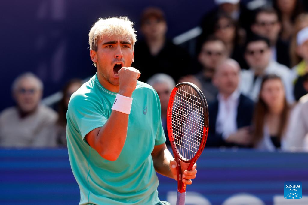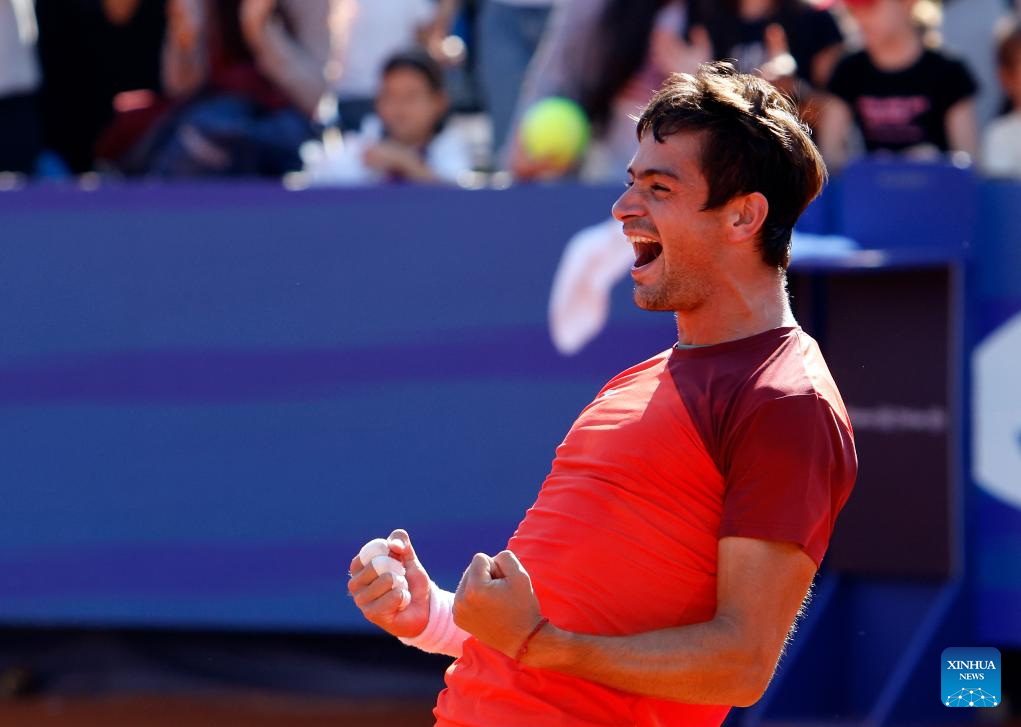 Daniel Merida of Spain celebrates scoring during the final match against Mariano Navone of Argentina at the ATP 250 Tiriac Open tennis tournament in Bucharest, Romania, April 5, 2026. (Photo by Cristian Cristel/Xinhua)