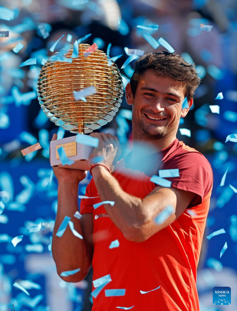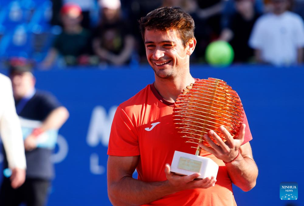 Mariano Navone of Argentina celebrates with the trophy after winning the final match against Daniel Merida of Spain at the ATP 250 Tiriac Open tennis tournament in Bucharest, Romania, April 5, 2026. (Photo by Cristian Cristel/Xinhua)