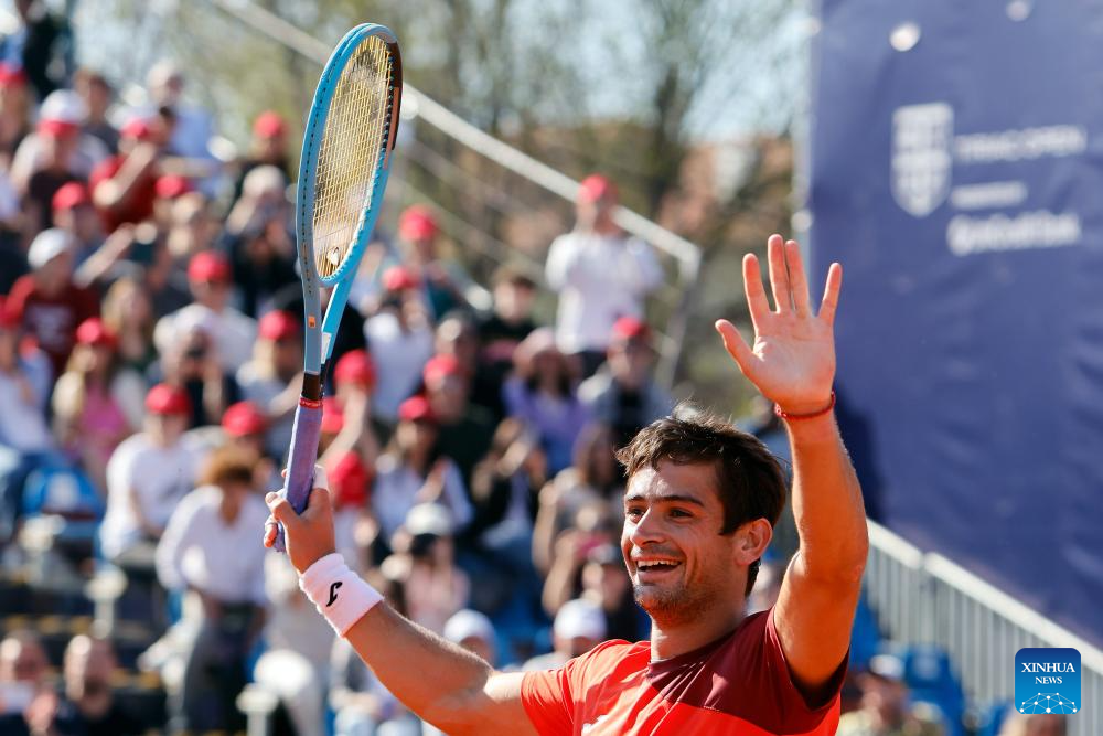 Mariano Navone of Argentina celebrates after winning the final match against Daniel Merida of Spain at the ATP 250 Tiriac Open tennis tournament in Bucharest, Romania, April 5, 2026. (Photo by Cristian Cristel/Xinhua)