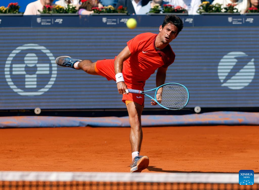 Mariano Navone of Argentina serves the ball to Daniel Merida of Spain during the final match of ATP 250 Tiriac Open tennis tournament in Bucharest, Romania, April 5, 2026. (Photo by Cristian Cristel/Xinhua)
