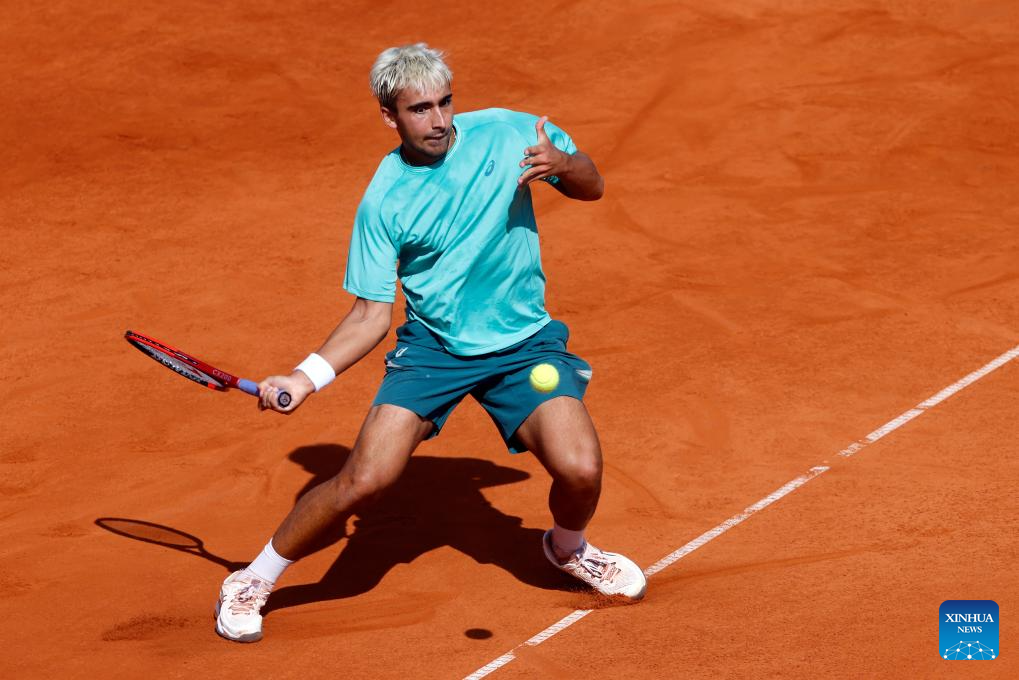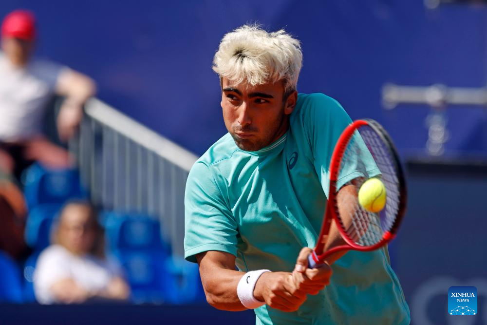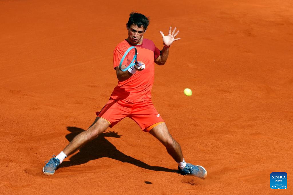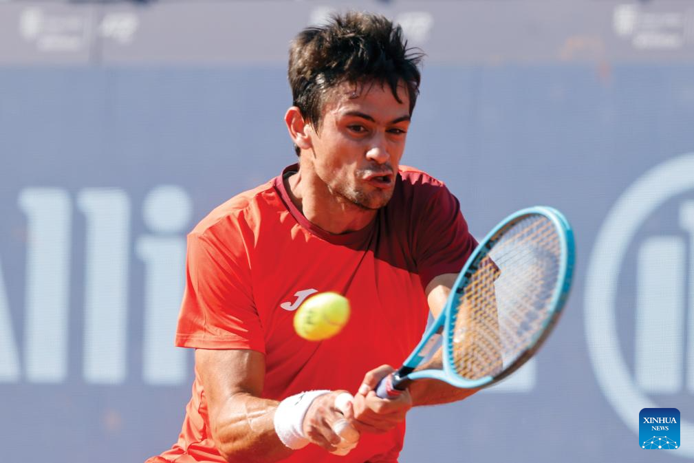 Daniel Merida of Spain returns the ball to Mariano Navone of Argentina during the final match of ATP 250 Tiriac Open tennis tournament in Bucharest, Romania, April 5, 2026. (Photo by Cristian Cristel/Xinhua)