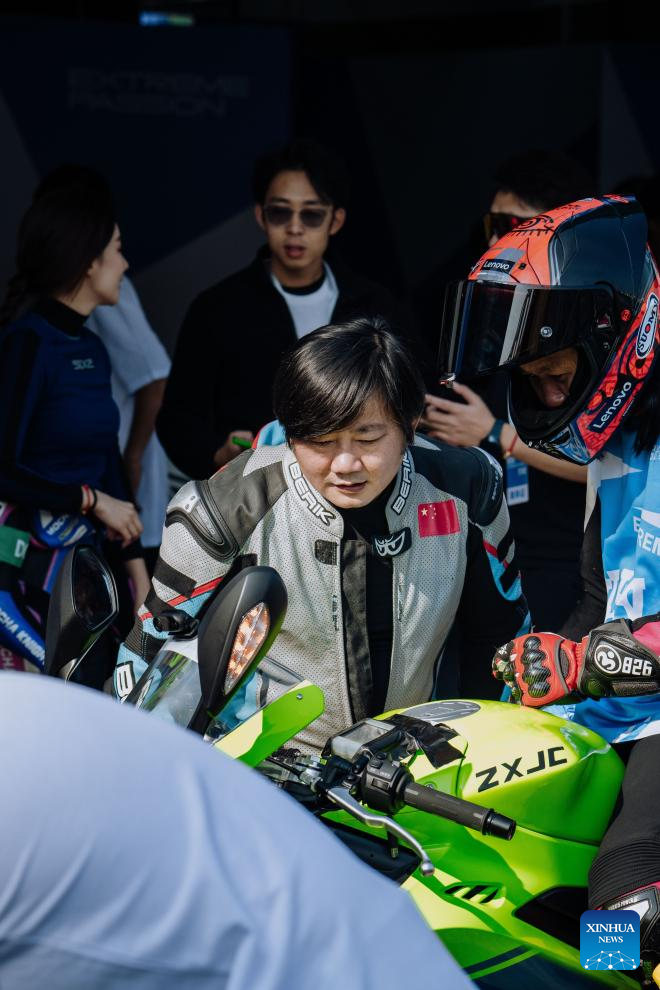 Zhang Xue (front) test-drives a motorcycle at Zhuhai International Circuit in Zhuhai, south China's Guangdong Province, on Jan. 16, 2025. (Xinhua)