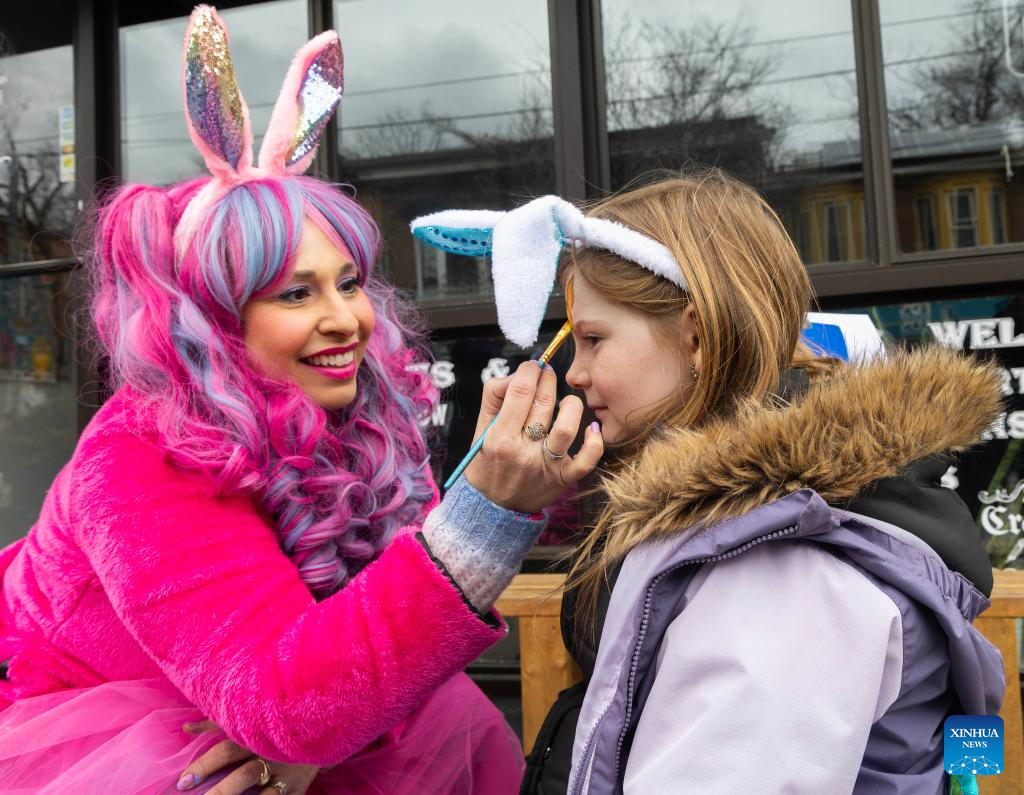 A girl participates in a face-painting activity during the 2026 Toronto Beaches Lions Easter Parade in Toronto, Canada, on April 5, 2026. (Photo by Zou Zheng/Xinhua)