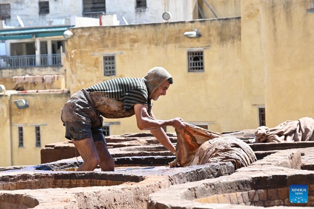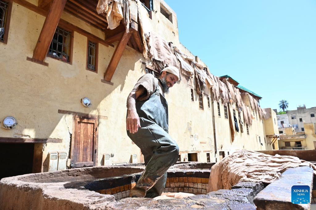 An employee works at a leather tannery in Fes, Morocco, on April 5, 2026. Fes, a city in northern Morocco with a history spanning more than 1,200 years, is renowned for its leather goods, which are popular around the world. Locals still process hides by hand, with natural ingredients used in the softening stage and natural dyes for coloring. The process takes weeks and is carried out without the use of any modern machinery. (Photo by Aissa/Xinhua)