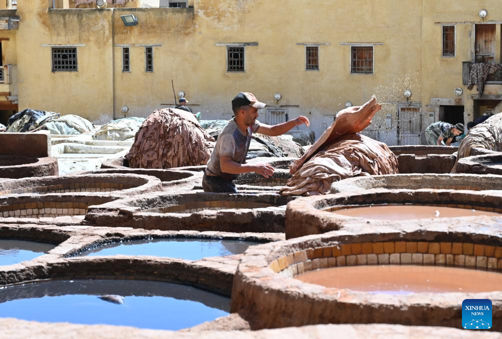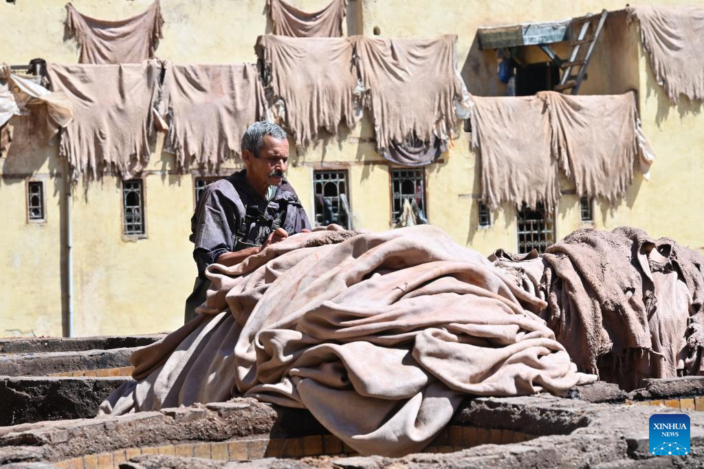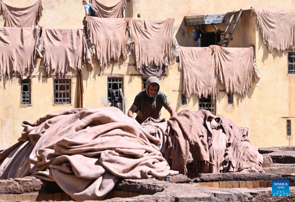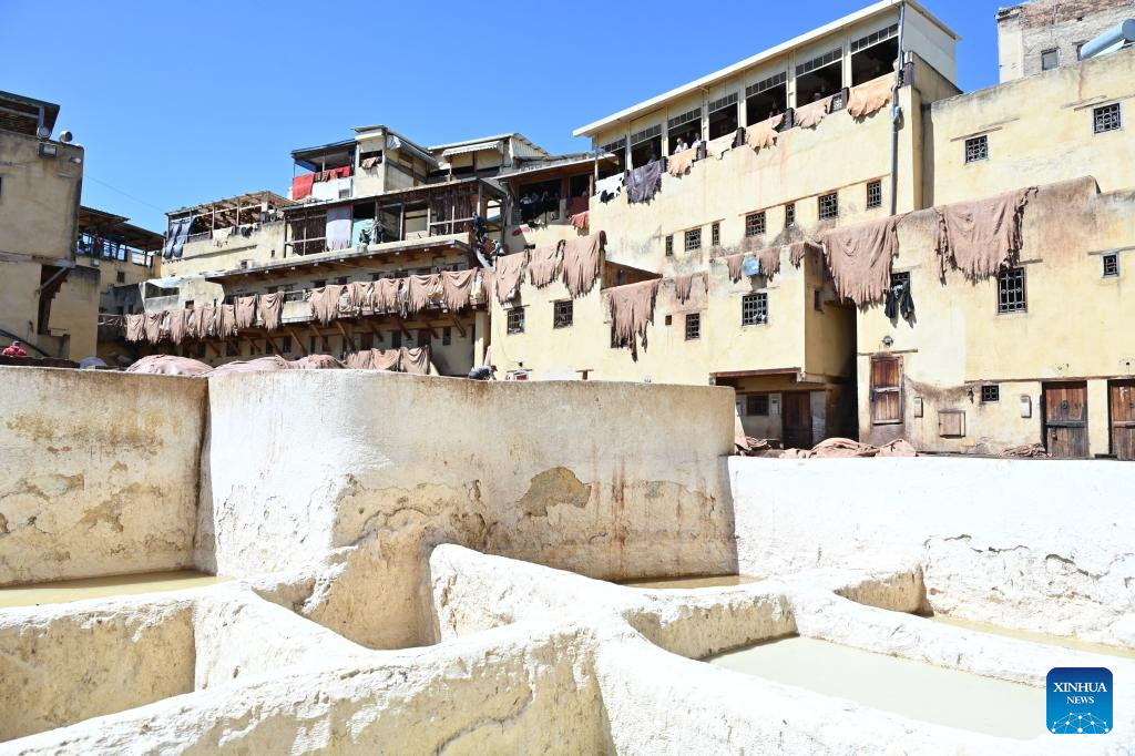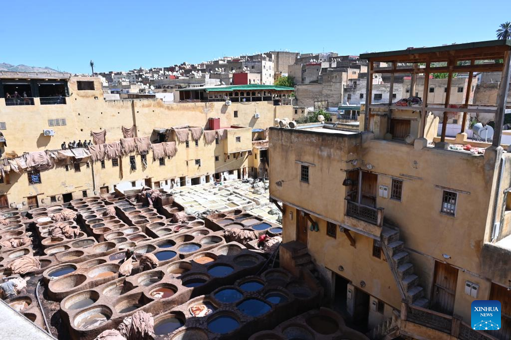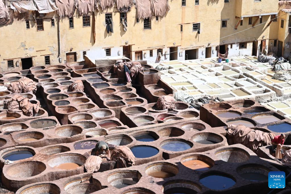 This photo taken on April 5, 2026 shows a view of a leather tannery in Fes, Morocco. Fes, a city in northern Morocco with a history spanning more than 1,200 years, is renowned for its leather goods, which are popular around the world. Locals still process hides by hand, with natural ingredients used in the softening stage and natural dyes for coloring. The process takes weeks and is carried out without the use of any modern machinery. (Photo by Aissa/Xinhua)