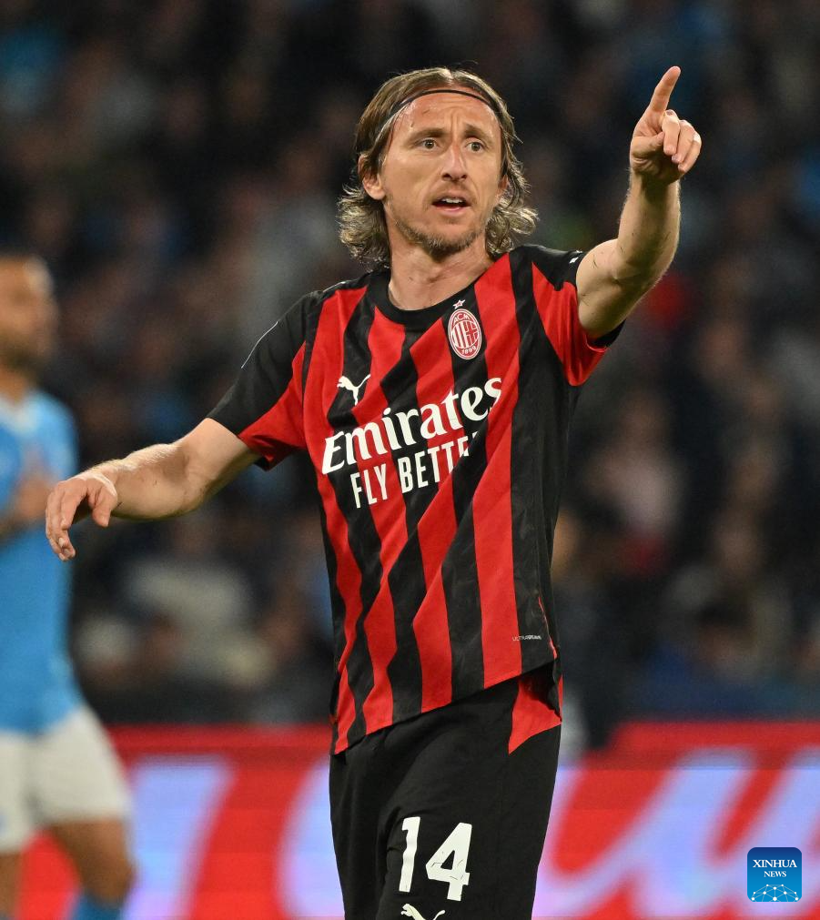 AC Milan's Luka Modric gestures during a Serie A football match between Napoli and AC Milan in Naples, Italy, April 6, 2026. (Photo by Alberto Lingria/Xinhua)
