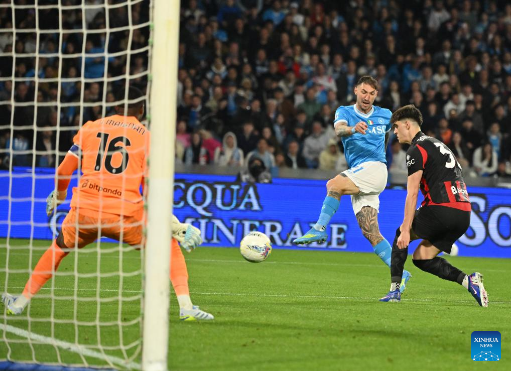 Napoli's Matteo Politano (C) scores during a Serie A football match between Napoli and AC Milan in Naples, Italy, April 6, 2026. (Photo by Alberto Lingria/Xinhua)