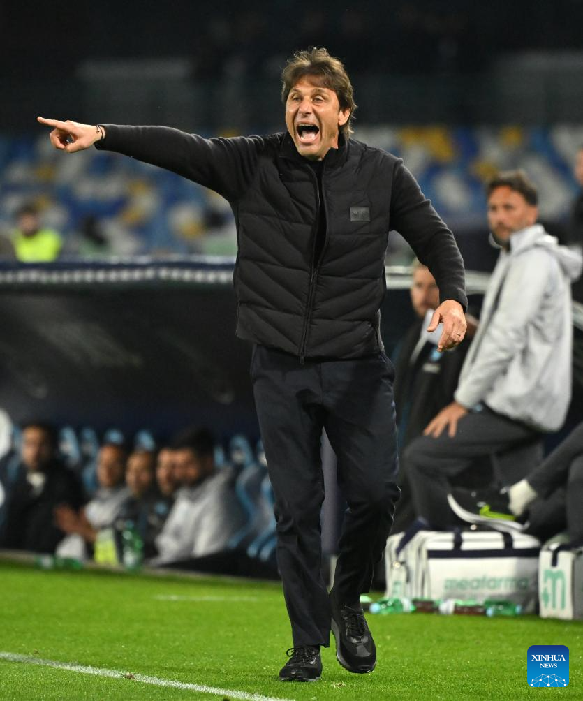 Napoli's head coach Antonio Conte reacts during a Serie A football match between Napoli and AC Milan in Naples, Italy, April 6, 2026. (Photo by Alberto Lingria/Xinhua)