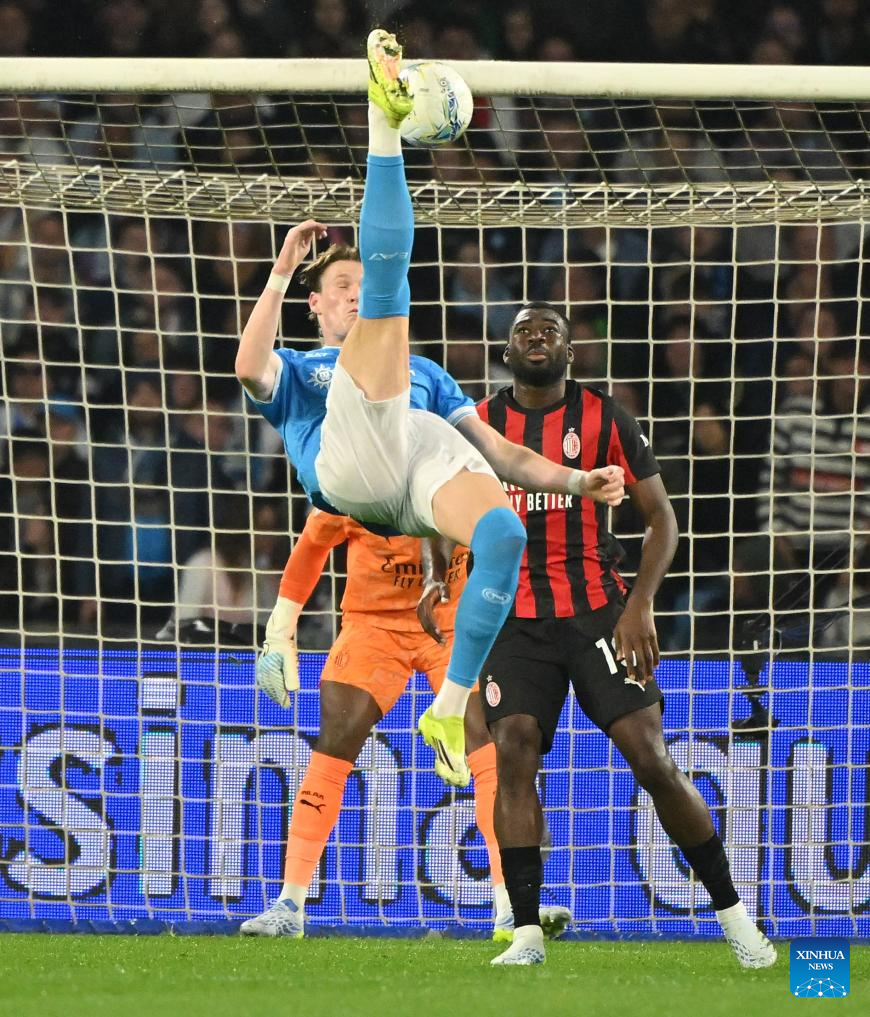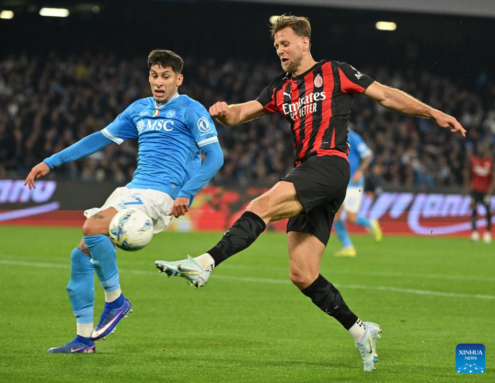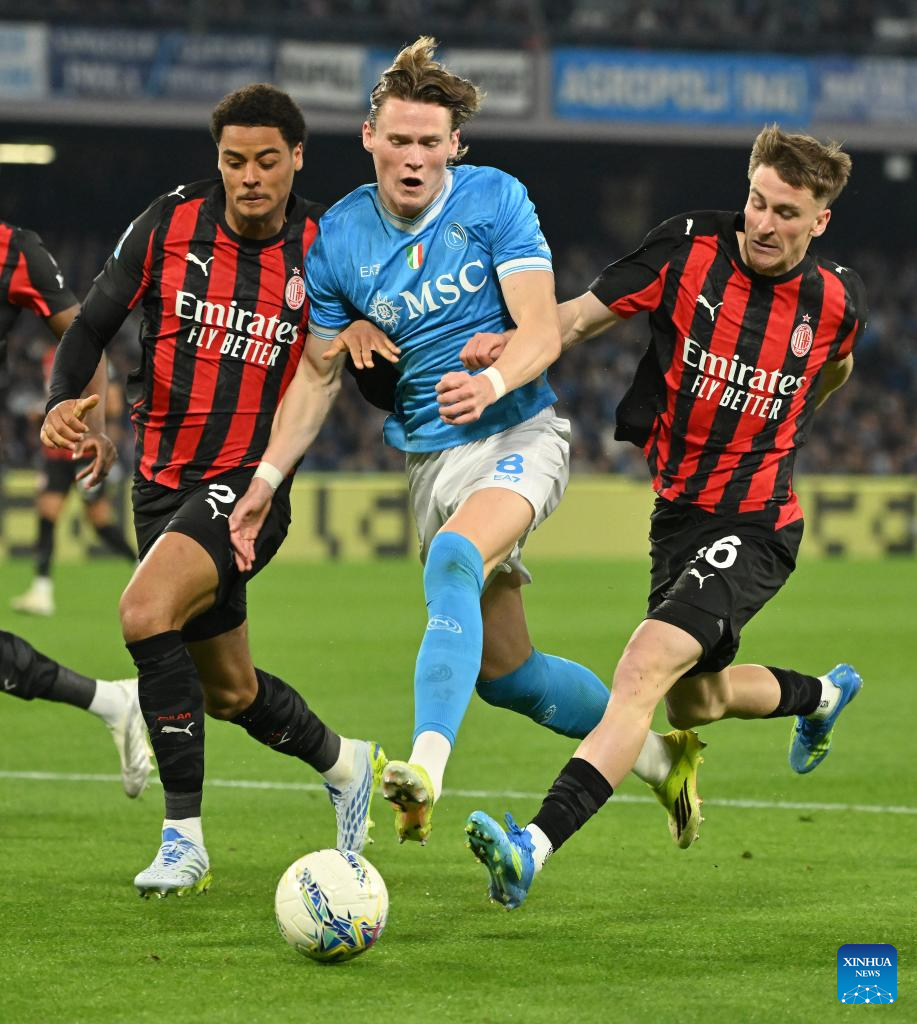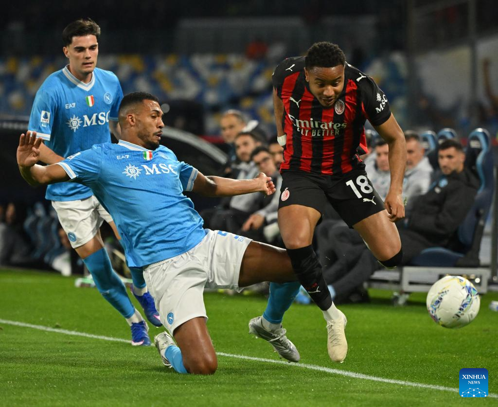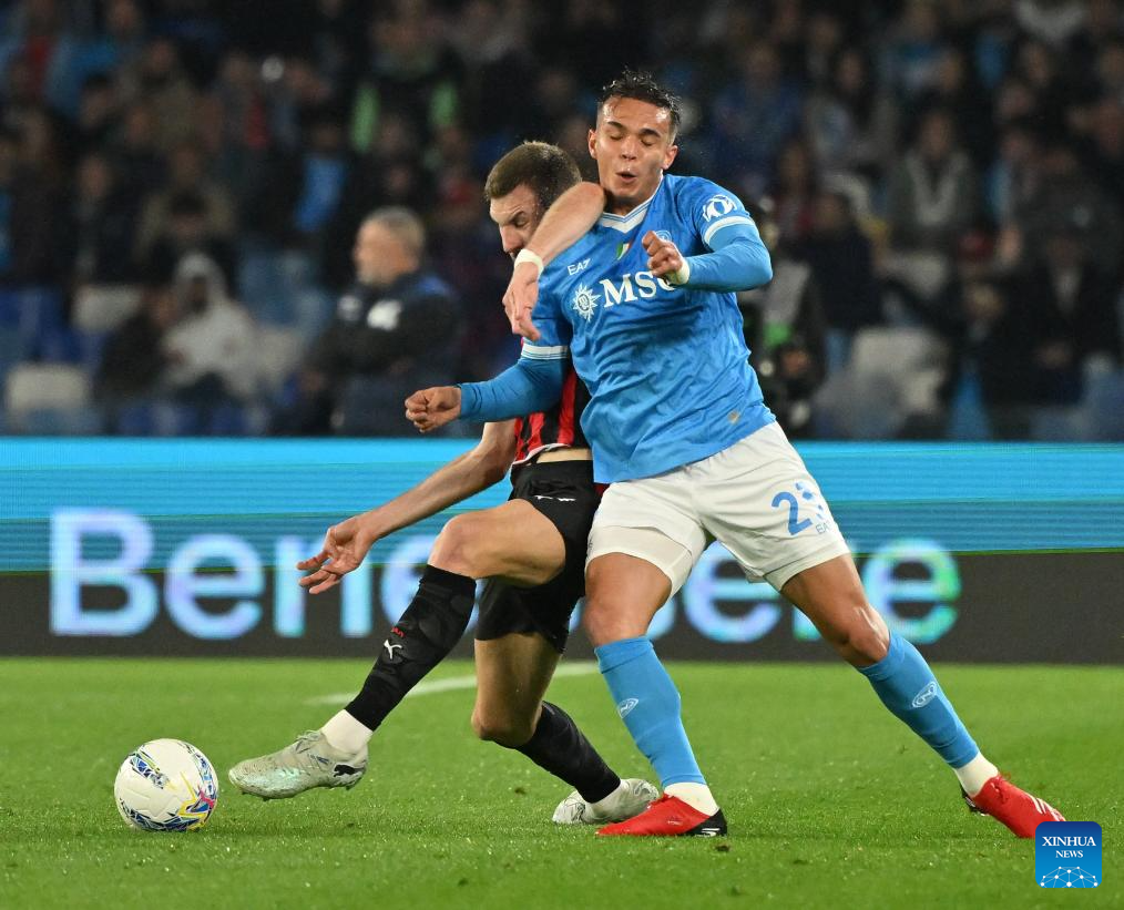 Napoli's Juan Jesus (C) vies with AC Milan's Christopher Nkunku (R) during a Serie A football match between Napoli and AC Milan in Naples, Italy, April 6, 2026. (Photo by Alberto Lingria/Xinhua)