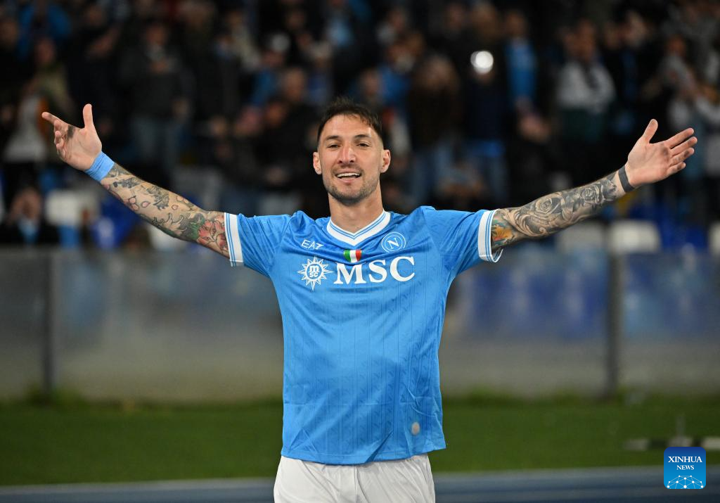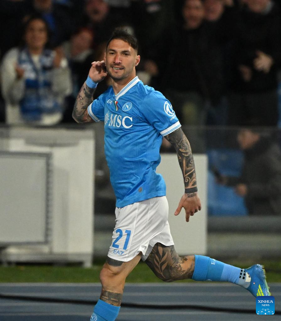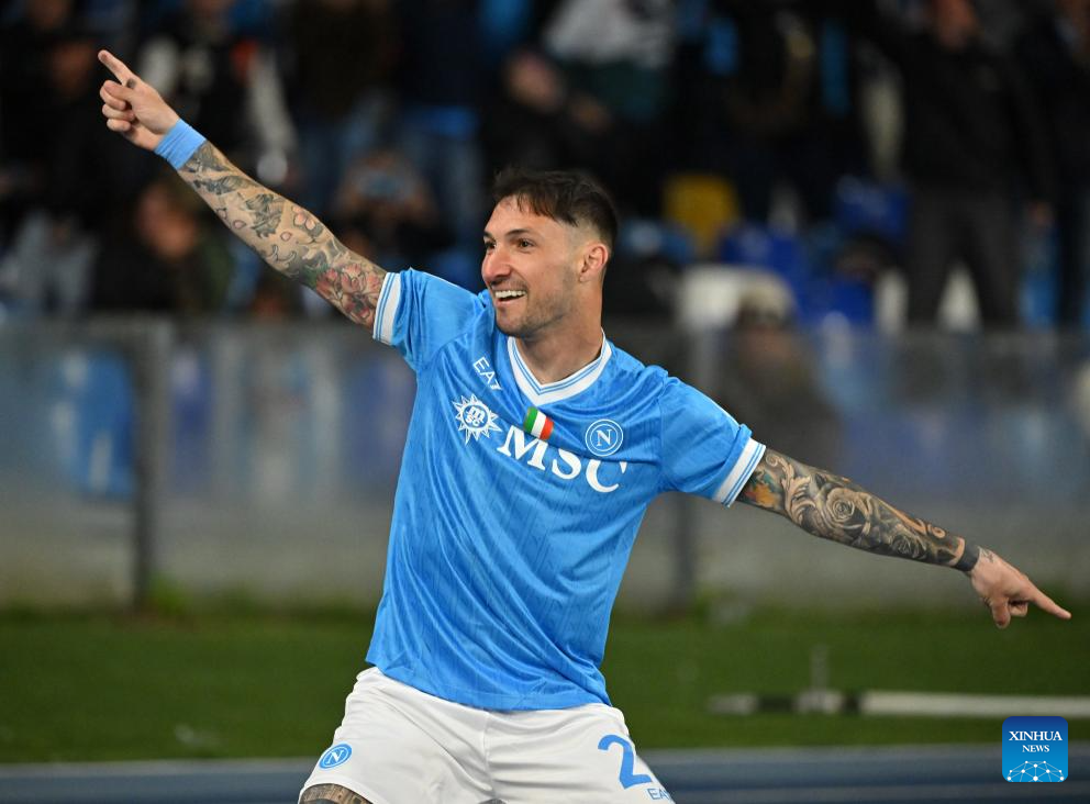Napoli's Matteo Politano celebrates his goal during a Serie A football match between Napoli and AC Milan in Naples, Italy, April 6, 2026. (Photo by Alberto Lingria/Xinhua)