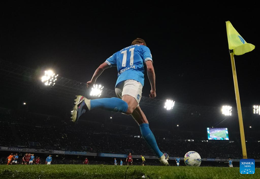 Napoli's Kevin De Bruyne takes a corner kick during a Serie A football match between Napoli and AC Milan in Naples, Italy, April 6, 2026. (Photo by Alberto Lingria/Xinhua)