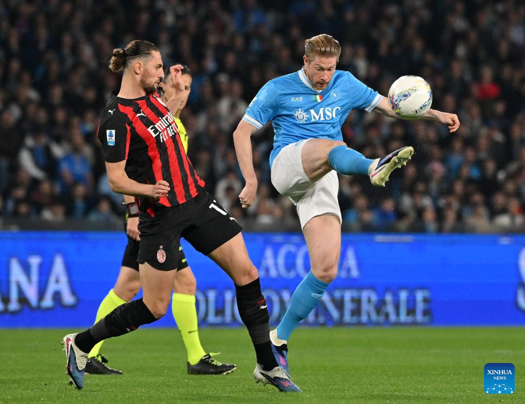 Napoli's Kevin De Bruyne (R) vies with AC Milan's Adrien Rabiot (L) during a Serie A football match between Napoli and AC Milan in Naples, Italy, April 6, 2026. (Photo by Alberto Lingria/Xinhua)