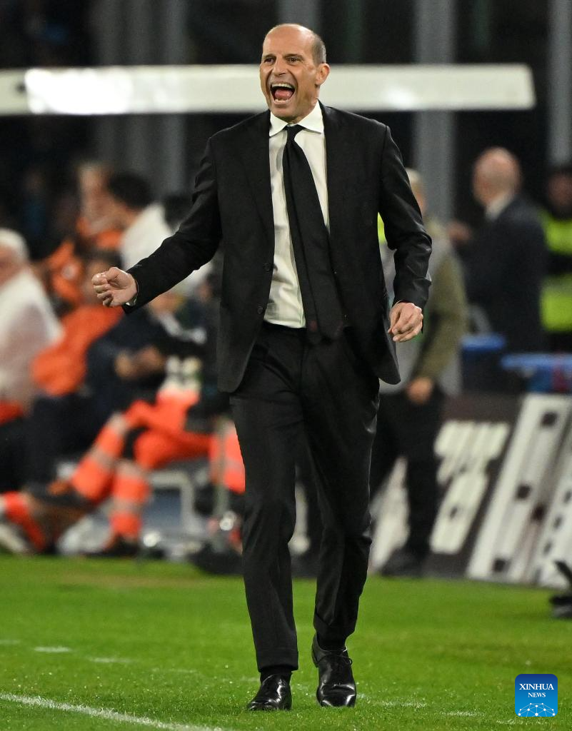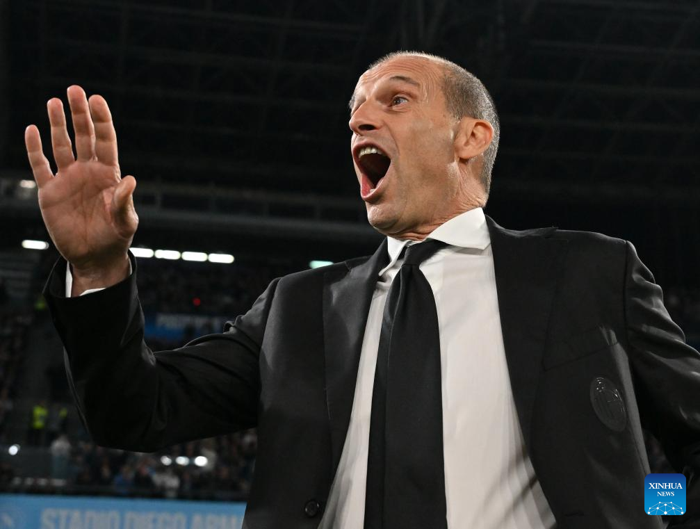 AC Milan's head coach Massimiliano Allegri reacts during a Serie A football match between Napoli and AC Milan in Naples, Italy, April 6, 2026. (Photo by Alberto Lingria/Xinhua)