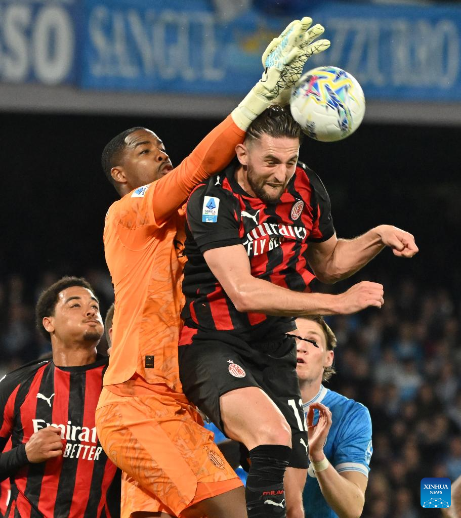 AC Milan's Mike Maignan (C) and Adrien Rabiot (R) compete during a Serie A football match between Napoli and AC Milan in Naples, Italy, April 6, 2026. (Photo by Alberto Lingria/Xinhua)