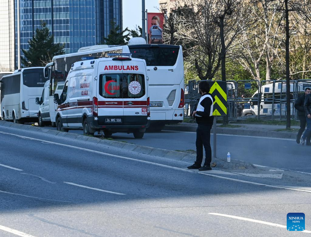 An ambulance heads toward the scene after a shootout near the Israeli consulate in Istanbul, Türkiye, April 7, 2026. One attacker was killed and four others, including two police officers and two attackers, were wounded Tuesday during a shootout near the Israeli consulate in Istanbul's Besiktas district, a local official said. (Xinhua/Liu Lei)