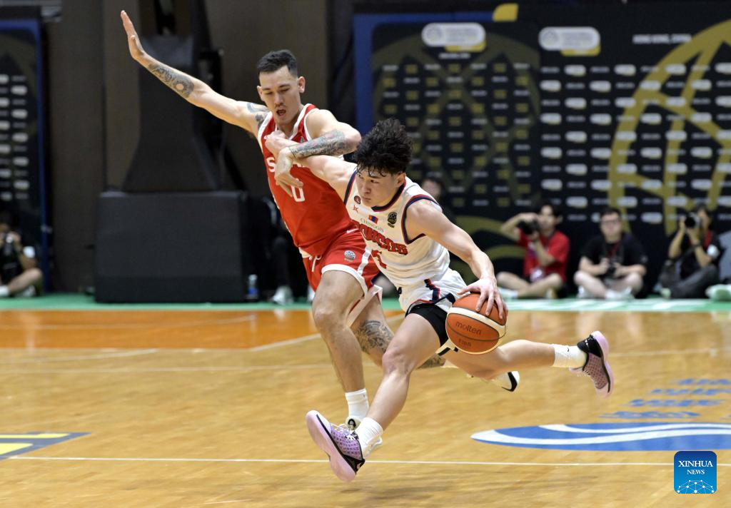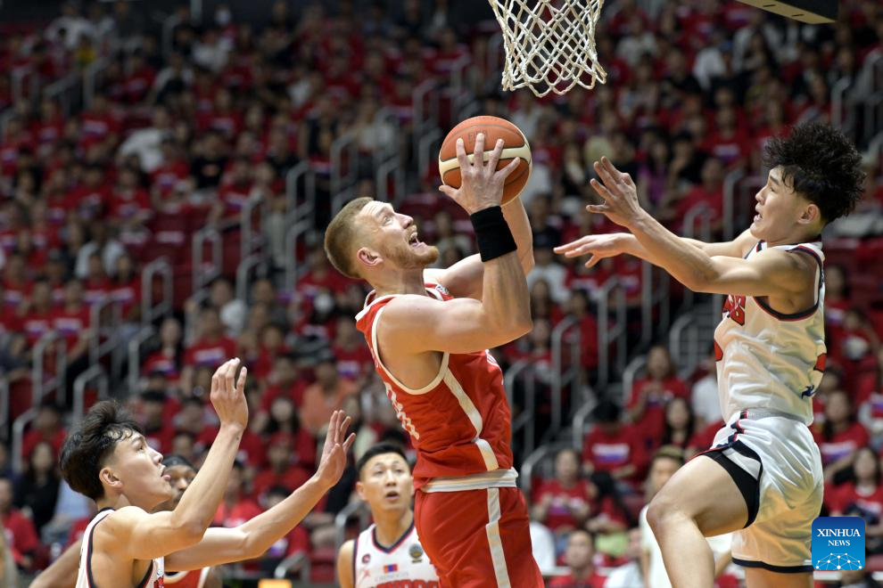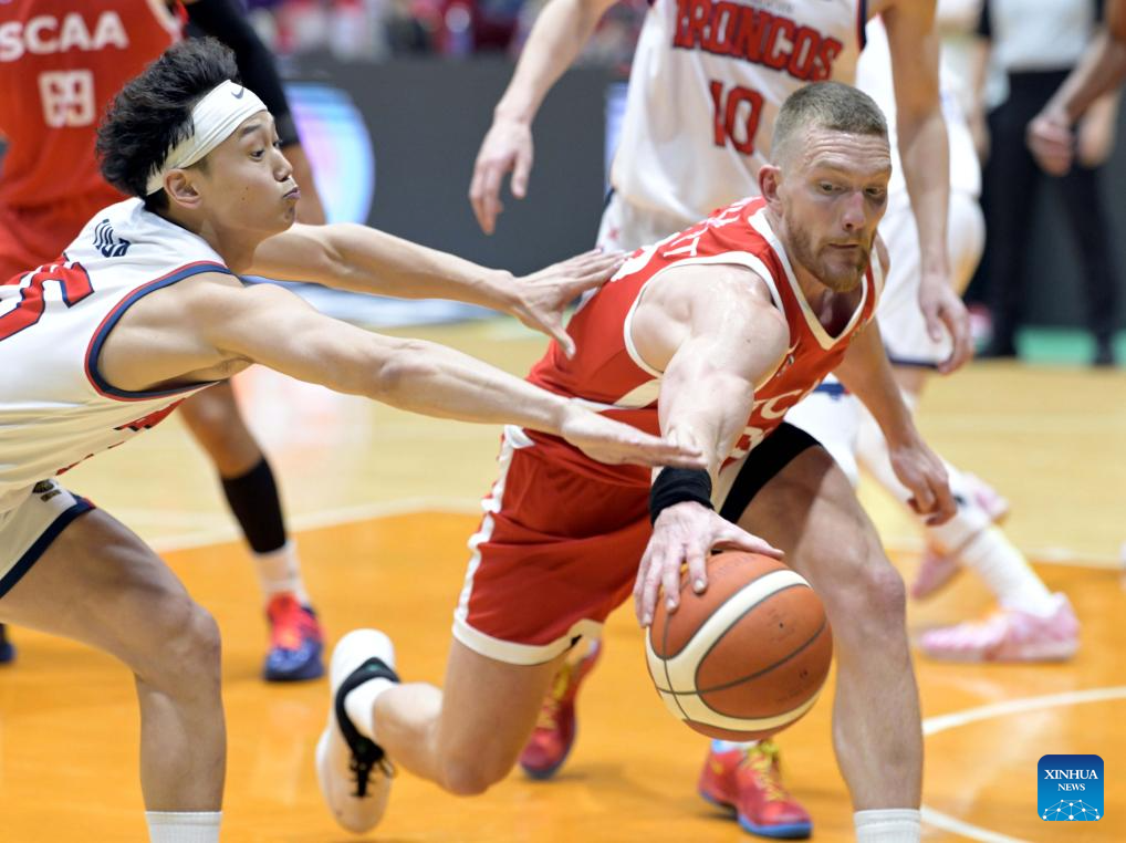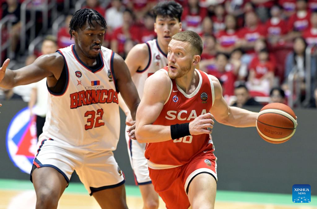 Dominic Gilbert (R) of South China Athletic vies with Tulga Odgerel of XAC Broncos during the 2026 Basketball Champions League Asia-East group phase group B match between South China Athletic and XAC Broncos in Hong Kong, south China, April 6, 2026. (Xinhua/Lo Ping Fai)